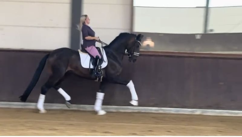 Hoch veranlagtes Dressurpferd mit Top Charakter. Auch von reitern ohne Jungpferdeerfahrung zu reiten. Sehr aktive und tragende Hinterhand. Bietet spielerisch schon viel von alleine an. Mehrfach Reitpferde mit Noten bis 8.5 Platziert. Nur in fördernde Hände zu verkaufen! Sehr brav im Umgang und auf dem Tunier.