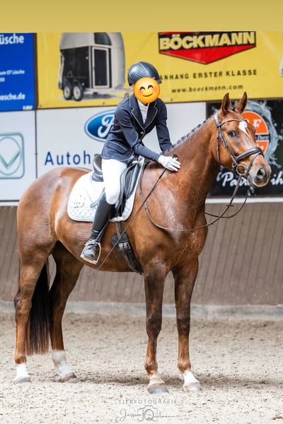 This four-year-old dark chestnut gelding (approximately 16.1 hh) comes from a reputable breeder and impresses with his calm demeanor, reliability, and well-balanced temperament. His sire is Total Hope, a son of Totilas and Weihegold OLD, successful up to Grand Prix level. The dam line, featuring Blickpunkt (Belissimo), Donnerball, and Quattro B, boasts excellent dressage bloodlines. He has been gently started under saddle and demonstrates a ground-covering walk, a regular trot, and a strong uphill tendency in canter. In handling, at the blacksmith, and during loading (even alone), he is always well-behaved and uncomplicated, also safe around children. Thanks to his completely confident nature and fearless attitude, we see Torsti as an ideal prospect for riders transitioning to higher levels or as a family horse. He could also be interesting for vaulting, although this has not yet been tested. Currently, he is kept in a paddock with a small mixed herd. X-rays are available. An honest, high-quality gelding with a promising future, still at the very beginning of his career as a riding horse – sold directly from the breeder to a good home.