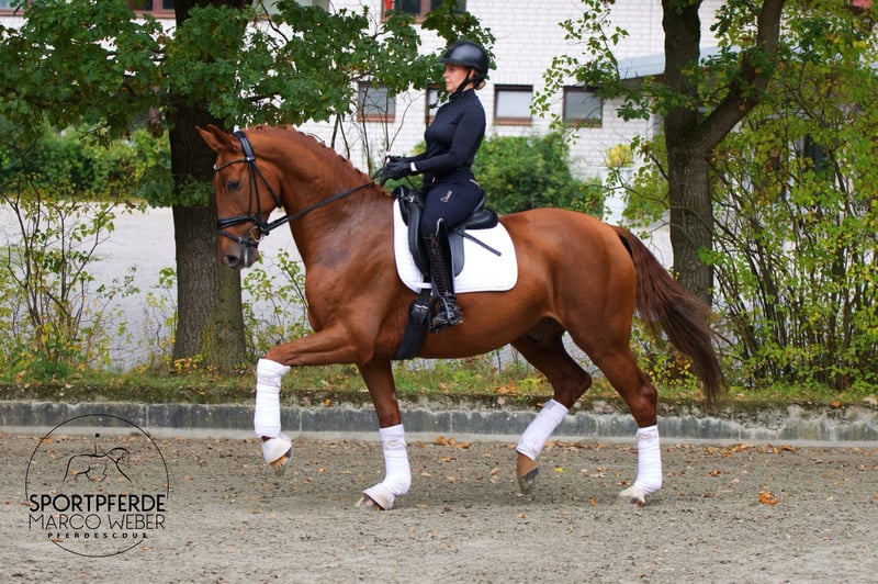 Oldenburger • Wallach • *2020 • 1,72 m ⚜️ Best of Gold – Desperado ⚜️ 🎁 Fuchsfreunde aufgepasst! 🎁 Ein wunderschön aufgemachter Wallach vom Best of Gold, der mit Charme, Ausstrahlung und einem außergewöhnlich guten Charakter überzeugt. Sein ehrliches, freundliches Wesen macht ihn zu einem absolut verlässlichen Partner im täglichen Umgang und unter dem Sattel – ein echtes Herzenspferd! 🏅 Sieger in Dressurpferde A 🏅 Ausgestattet mit drei sehr guten Grundgangarten, toller Bergauftendenz und einer hervorragenden Arbeitseinstellung. Typvoll, korrekt im Exterieur und mit viel Qualität für die Zukunft. Er macht jeden Tag Freude beim Reiten – motiviert, rittig und immer bei seinem Reiter. Durch seine ausgeglichene Art ist er für wirklich jeden geeignet, ob ambitionierter Amateur, Umsteiger oder Profi. Bei weiterer Förderung sicher ein Kandidat für das große Viereck – ein Pferd mit Perspektive und Herz! ❤️ Eine klare Empfehlung für alle, die ein herausragendes junges Dressurpferd suchen! 📍 Standort: Nähe Osnabrück 📋 Ein guter Röntgen-TÜV liegt vor. 📞 Weitere Informationen gerne unter: +49 173 3013499
