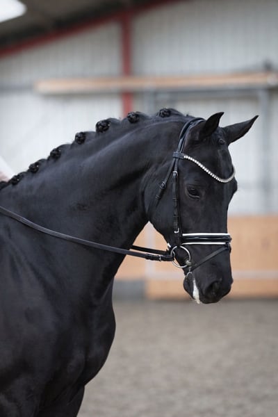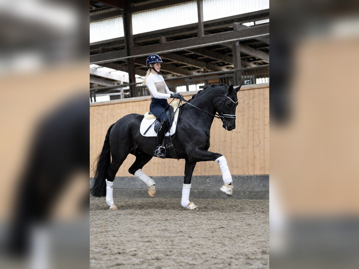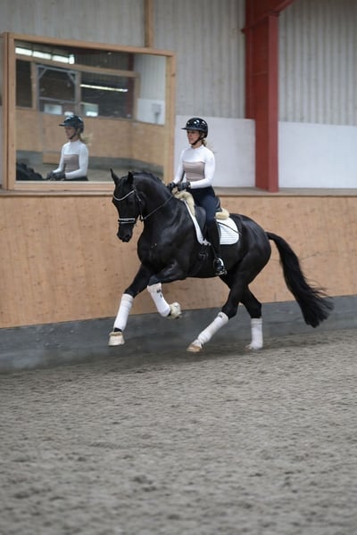 For sale is the charismatic and impressive gelding Riovaldi. He was presented at the Oldenburg licensing in Vechta in early 2024 and received a positive licensing verdict. Subsequently, he was castrated at the age of three and has since enjoyed a wonderful life as a riding horse. Riovaldi impresses with three outstanding basic gaits, a stunning appearance in his dark coat, and plenty of quality under the saddle. He is currently being gently introduced to L-level dressage movements, such as extended trot, canter-trot transitions, walk-canter transitions, and flying changes, all of which he performs confidently. In addition, he shows remarkable talent for piaffe and passage, bringing great joy to his rider every day. In handling, he is uncomplicated, friendly, and steady-nerved, both in daily interactions and within the herd. He also comes from a highly interesting dam line: His mother, Venecia OLD, was Vice Federal Champion and has competed successfully up to Inter I. Please no email inquiries, only contact by phone. Information provided without guarantee. Price plus VAT.