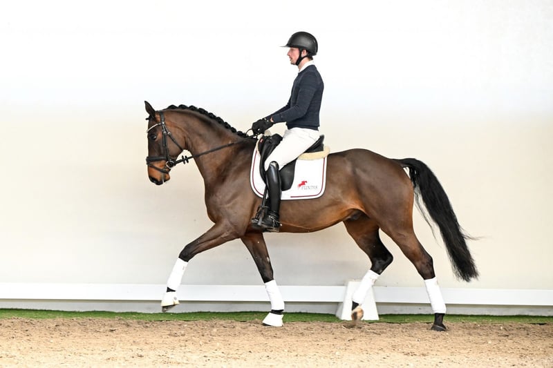 This 6-year-old gelding presents himself as a likeable and honest young prospect who has not yet been shown in public. With his well-proportioned size, an attractive outline, and natural elegance, he makes a very harmonious overall impression. In trot, he is expressive, rhythmical, and moves consistently through his body – comfortable to sit and always easy to regulate. Overall, he is a horse that demonstrates clear, correct, and appealing movement. Particularly noteworthy is his rideability: well-behaved, uncomplicated, and attentive to the rider’s aids. He gives a secure feeling under saddle and impresses with his cooperative attitude in daily work. A horse that is simply a pleasure to ride and presents himself as a reliable partner. His pedigree is equally appealing: his sire, Fynch Hatton, stands for modern dressage quality and excellent rideability. On the dam’s side, Top Gear OLD – especially renowned for his outstanding character and rideability – further reinforces these traits. Combined with Hotline and Sandro Hit, he offers proven and solid dressage genetics. An ideal horse for riders seeking an uncomplicated, rideable, and genuine partner for both everyday enjoyment and success in dressage sport.