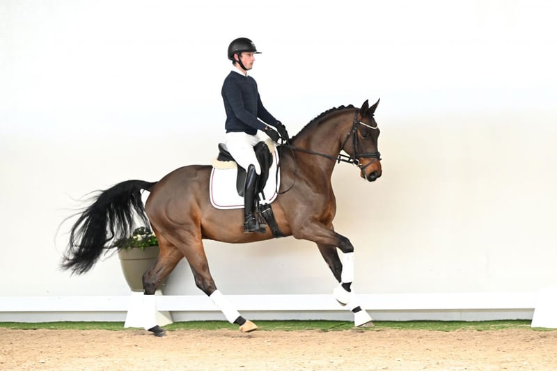 This 6-year-old gelding presents himself as a likeable and honest young prospect who has not yet been shown in public. With his well-proportioned size, an attractive outline, and natural elegance, he makes a very harmonious overall impression. In trot, he is expressive, rhythmical, and moves consistently through his body – comfortable to sit and always easy to regulate. Overall, he is a horse that demonstrates clear, correct, and appealing movement. Particularly noteworthy is his rideability: well-behaved, uncomplicated, and attentive to the rider’s aids. He gives a secure feeling under saddle and impresses with his cooperative attitude in daily work. A horse that is simply a pleasure to ride and presents himself as a reliable partner. His pedigree is equally appealing: his sire, Fynch Hatton, stands for modern dressage quality and excellent rideability. On the dam’s side, Top Gear OLD – especially renowned for his outstanding character and rideability – further reinforces these traits. Combined with Hotline and Sandro Hit, he offers proven and solid dressage genetics. An ideal horse for riders seeking an uncomplicated, rideable, and genuine partner for both everyday enjoyment and success in dressage sport.