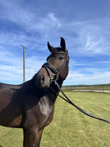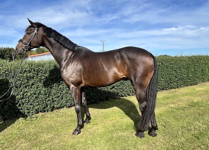 Ce hongre de 7 ans, mesurant environ 175 cm, issu de For Dance x Fürst Romancier, a un grand potentiel pour le sport équestre en dressage. Cependant, il n'a été monté que peu jusqu'à récemment et a besoin d'un(e) cavalier(e) expérimenté(e) pour sa formation ultérieure. Il est calme en main et sous la selle, mais parfois un peu distrait par son environnement, il n'est donc pas adapté aux débutants. Il présente un défaut esthétique au niveau de la croupe, qui n'impacte cependant pas son mouvement. Le hongre est proposé à la vente pour le compte de l'éleveuse. Pour plus d'informations, n'hésitez pas à appeler le 0177 6854203.