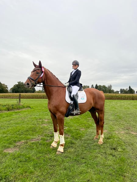 This gelding is truly special, with a heart of gold! Dia Bonito is not only impressive in size but also a rock-solid presence in the arena. He remains unshaken in any situation, whether during daily training, on a trail ride, or at competitions. Bonito always instills confidence in his rider and simply wants to please. In addition to his excellent temperament and smooth ride, he is also an outstanding schoolmaster for class L. He masters all the movements with great confidence, whether on a snaffle or a bitless bridle. He has proven this at competitions and has achieved high placements in L-level dressage. The movements of class M have been introduced playfully, and he shows a very eager-to-learn attitude here as well! Off the competition arena, he always performs wonderfully—he enjoys hacking out, can do gymnastic jumps, and is absolutely straightforward in handling. Bonito has a valid health certificate, has never been ill, and has no health restrictions or special needs. If you're looking for a reliable, all-in-one package, Bonito is the perfect choice!