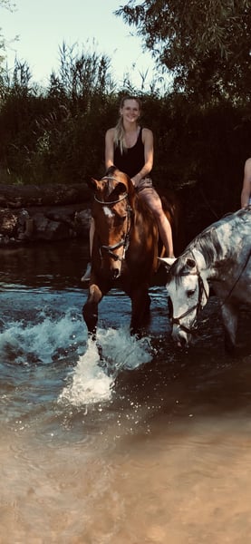 Fly is 13 years old, approximately 15.1 hh, and an absolute gentle giant. I purchased him at the age of 4, and since then, we have been through thick and thin together. It is especially difficult for me to make this announcement, but I wish for him to find the best possible home where he can stay forever.
