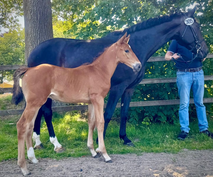 Sporty and bred from one of the most successful mare lines - born 21.05.2025 Mother Elite Mare Honey Moon has already produced five S-successful top horses and state premium mares, including: Cold Play by Contendro I (1.65m under Fredrik Jönsson (SWE) and silver medal in Tryon (USA) 2018); Quidam MB by Quidam's Rubin (international 1.60m with Adrienne Sternlicht (USA)); The Dude by Carry Gold (1.60m under Samuel Hutton (GBR)); Cornet Star by Cornet Obolensky (international 1.45m with Rachel Sandoz (SUI)) as well as Honey Pearl by Emerald van’t Ruytershof (international 1.45m - Dries van der Linden (BEL)) Honey Girl by Clinton (state premium and elite mare with internationally S**-successful offspring) Honey Star by Balou du Rouet (reserve champion mare of the elite mare show in Rastede with a score of 10.0 in free jumping) further successful horses from the mother line see photo.
