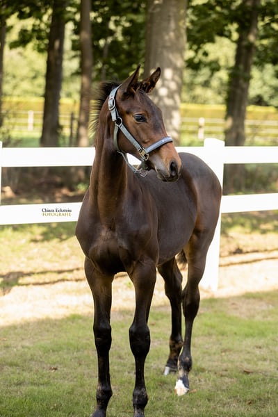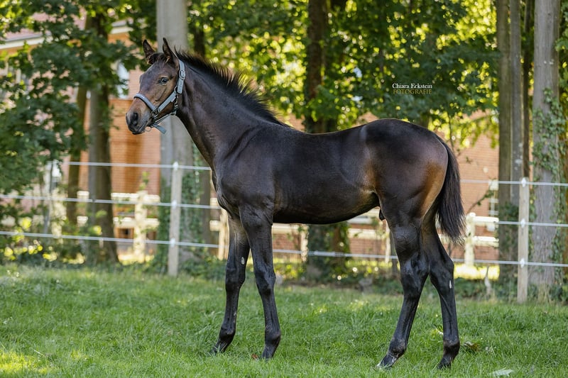 Die Mutter dieses großrahmigen Hengstfohlens war selbst in Springen der Klasse S erfolgreich, bevor sie in die Zucht ging. Die Großmutter entstammt dem bedeutenden Holsteiner Stamm776 aus dem viele international erfolgreiche Springpferde hervorgehen. Sie selbst brachte bis GP-erfolgreiche Springpferde und gekörte Söhne. Der Vater des Fohlens Diablue PS steht auf der Deckstation Paul Schockemöhle und war Sieger seiner Hengstleistungsprüfung mit der Note 9,29; für sein Vermögen und die Leistungsbereitschaft erhielt er die 10,0. Er hat bereits erste Hengstsöhne und hochpreisige Auktionsfohlen hervorgebracht.