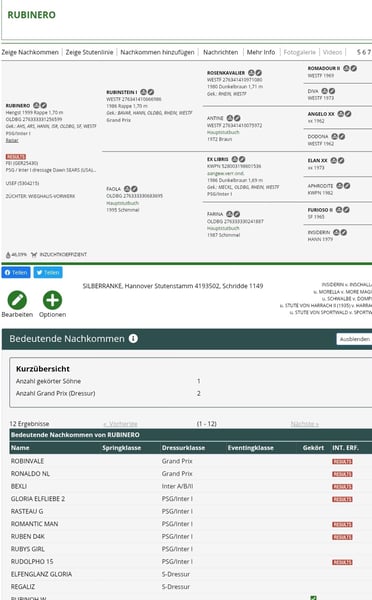 Wspaniała bezpośrednia klacz od Dimaggio z powodu potomstwa na najlepszym miejscu! Rzadko spotykana krew Rubinstein I. szuka tutaj nowego, idealnego miejsca. Jej matka jest siostrą pełną do Rubinero OLD (z sukcesami w konkursach). Dimaggio x Rubinstein I. x Ex Libris x Inschallah (rodowód Silberranke) w ciąży z Black or White Bordeaux (Bordeaux x Rohdiamant, ujeżdżenie S) Na zdjęciu 3 widać Black or White Bordeaux. Źrebię spodziewane pod koniec 03/26. Zarejestrowana w OL i Austrii. Zawsze natychmiast w ciąży, bezproblemowe porody, świetna mama, bardzo towarzyska, bardzo spokojna w obsłudze, sprzedawana wyłącznie ze względu na potomstwo.