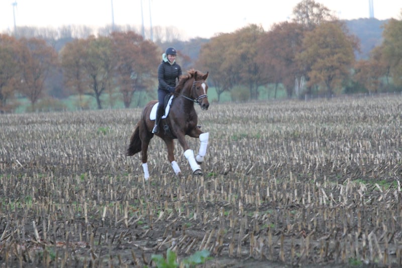 Esta hermosa yegua castaña oscuro no podría ser pintada de manera más bonita. Con su magnífico rostro y su gran ojo sincero, atrae las miradas de inmediato. Su excelente carácter lo transmite a su igualmente enérgica descendencia. Desciende de la cría de la familia Henschke a través de Fürst Romancier - Connery - Donnerhall - Pik Bube I - Der Löwe xx. Del estrecho linaje de yeguas de Delfina provienen, entre otros, el semental aprobado Akim de Argentinus y el exitoso en el deporte Bailamor de Amor de Breitling W. La hermana de esta yegua, Samantha de San Amour, ha presentado varias veces el potro ganador en la exhibición en la cría W.M., y en 2021, Flavia de Fürst Toto - Sandro Hit se convirtió en la mejor subasta de la subasta en línea en Verden. La yegua lleva un potro al pie y está disponible en otoño de 2025, preñada de Global Hope. Se vende por encargo. Video disponible a solicitud.