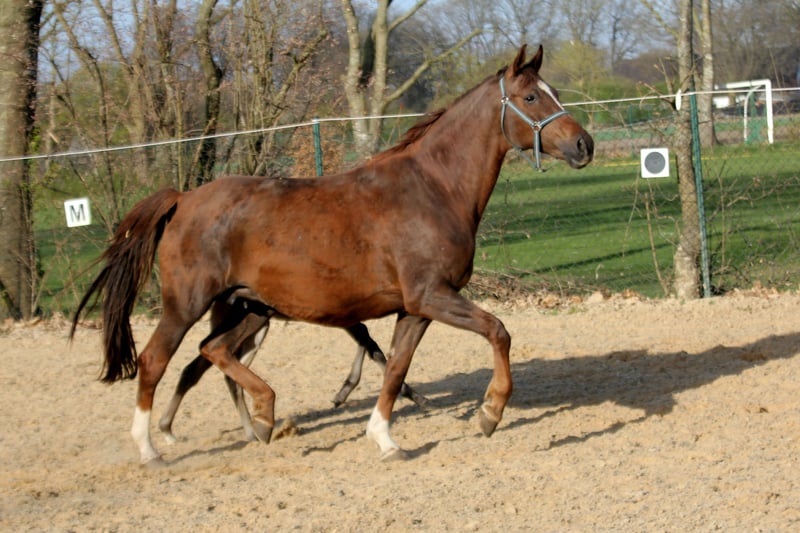 This stunning dark chestnut mare could not be painted more beautifully. With her lovely face and large honest eye, she immediately draws attention to herself. Her wonderful character is passed on to her equally athletic offspring. She comes from the breeding of the Henschke family, with lineage including Fürst Romancier - Connery - Donnerhall - Pik Bube I - Der Löwe xx. From the narrow mare line of Delfina, she is related to several notable horses, including the licensed stallion Akim by Argentinus and the sport-successful Bailamor de Amor by Breitling W. The sister of this mare, Samantha by San Amour, has produced the champion foal at the show at the W.M. stud multiple times, and in 2021, Flavia by Fürst Toto - Sandro Hit became the top auction horse at the online auction in Verden. The mare is accompanied by a foal at foot and is for sale, in foal to Global Hope for autumn 2025. For sale on behalf. Video available upon request.