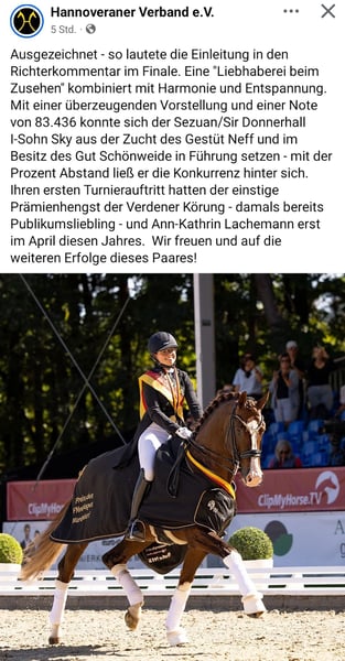 Córka Palomino Escolar Hiliarite MD, której matka już wydała na świat trzech ogierów z licencją, trzy klacze z nagrodą państwową oraz kilka potomków odnoszących sukcesy sportowe, jest obecnie w ciąży z Sky na marzec 2026. Sprzedaż tylko z powodu wyjątkowego potomstwa na najlepsze miejsce. Klacz miała już kilka dobrze sprzedanych źrebiąt aukcyjnych. 2. pokolenie ogierzy z licencją: Wolkenwind v. Wolkentanz (SPR 1,40 m z sukcesami), Hokuspokus v. Brioni, Quantar MD v. Quaterback, Bosco v. Benicio Konie sportowe: Triple A MD v. Totilas (DR S z sukcesami), Hippophae v. Belissimo M (DR S z sukcesami), Ti voglio bene v. Totilas (DR M z sukcesami), Stam klaczy ogierzy z licencją: Dream in Gold v. Dream of Gold Matka: Hiliarite MDZL:1/1 Klacz hodowlana najwyższej klasy. Hiliarite MD jest czymś bardzo wyjątkowym dzięki swojemu pochodzeniu i kolorowi. Jest przyrodnią siostrą trzech licencjonowanych ogierów oraz kilku koni sportowych odnoszących sukcesy w klasach M i S. Posiada gen kremowy i przekazuje go swojemu potomstwu w 50%. Oczekuje źrebięcia od Sky na 26 marca. Istnieje zatem duża szansa na posiadanie Palomino od Sky-Escolar.