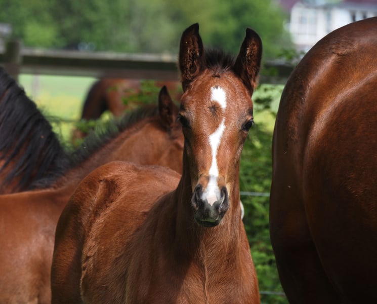 Dieses schicke und bewegungsstarke Stutfohlen stammt via Embryotransfer aus einer unheimlich ganggewaltigen Quaterback Stute, die selbst als Fohlen Preisspitze gewesen ist Durch den typisch kopfklaren und ausgeglichenen Charakter der für die Cafe au lait Linie kennzeichnend ist, wird auch dieses Nachwuchspferd für Amateure und schwächere Reiter ein toller Partner für Sport und Freizeit! Aus dem zweiten Jahrgang unseres Nachwuchshengstes "Cafe's Don Rubin", der bereits 3jährig auf seiner HLP als absolut jüngstes Pferd zu überzeugen wusste! Erst im August geboren, glänzte er trotz einem Altersrückstand von einem halben Jahr gegenüber vielen anderen 3jährigen durch seine Coolness, Leichtrittigkeit und positive Arbeitseinstellung. Im letzten Jahr 4jährig bei seinem dritten Turnier Springpferde A gewonnen und als einziger 4jähriger gegen 5 und 6jährige mit 8er Noten hoch platziert! Danach gewann er Bronze im Finale des Dobrocker Deister Springpferdechampionat in seiner ersten Springpferde-L überhaupt!! Inzwischen 5jährig Springpferde M platziert und qialifiziert zum Bundeschampionat. Parallel fungiert er trotz seines jungen Alters auch als Kinderlehrpferd für unsere 8jährige Tochter und absolviert problemlos mit 12jährigen Jungen E-Springen. Er überzeugt auf ganzer Linie durch Qualität, In- und Exterieur gleichermaßen! Begeistert täglich auf's Neue durch seine Rittigkeit, Lern- und Leistungsbereitschaft, dabei stets ausgeglichen und abgeklärt wie ein alter Hase. Auch im Gelände ein Traum! Absolut keine Hengstmanieren trotz Deckeinsatz. Unsere Fohlen bekommen täglich Mineralfutter und Fohlenstarter, regelmäßig EQUISTRO Haemolytan und Ipaligo Foal, Wurmkuren und Schmied sind natürlich ebenfalls selbstverständlich. Auch die Muttertiere bekommen die ganze Trächtigkeit hindurch spezielles Stutenfutter, täglich Saftfutter und Leinöl, sowie Heu ad libitum. So ist unsere Nachzucht stets im besten Gesundheitszustand. Weitere Fohlen und Nachwuchspferde aus eigener Zucht auf Anfrage. Es stehen auch immer wieder einige tragende Zuchtstuten zum Verkauf. Videoanfragen etc. ausschließlich vorab über WhatsApp möglich!