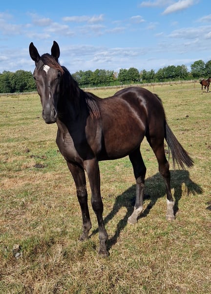 Nachwuchshoffnung mit bester Abstammung – Rappstute von Rock of Romance ×× x Fairbanks Zum Verkauf steht eine einjährige Rappstute mit herausragender Abstammung und vielversprechendem Potenzial für Sport und Zucht. Abstammung: Vater: Rock of Romance xx Muttervater: Fairbanks Diese Verbindung vereint Rittigkeit, Typstärke und Leistungsbereitschaft – ideale Voraussetzungen für eine Karriere im Dressurviereck oder für die Zucht. Beschreibung: Die junge Dame überzeugt mit guten Grundgangarten, einem ausdrucksstarken Bewegungsablauf und einem harmonischen Körperbau. Sie wächst artgerecht im Herdenverband auf. Ihr Wesen ist neugierig, aufgeschlossen und freundlich. Weitere Infos: Geboren: 2024 Geschlecht: Stute Farbe: Rappe Ein ideales Pferd für Menschen mit Zeit, Geduld und dem Wunsch, ihr zukünftiges Reitpferd selbst mitzugestalten. Standort: 29336 Nienhagen