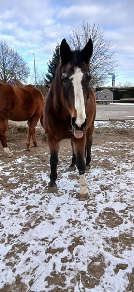 Due to health and financial reasons, I am seeking a loving and caring home for my mare with an experienced horse person. Costa Rica is a 19-year-old Oldenburg mare. She has been with me as a companion horse for the past year. She has experience in show jumping and dressage. Costa Rica is very people-oriented. Once she has built trust, she follows her human companion everywhere. However, she is not suitable for beginner riders. She has been retired by her original owner for the past five years. She has had bilateral front limb issues and a splinter fracture in her left hind knee. These conditions do not limit her in any way (medical records available). She has undergone osteopathy twice with no abnormalities detected. Costa Rica is not solely a companion horse. Despite her age, she is very fit and agile. I have worked with her on groundwork and horsemanship. After a settling-in period, she can be ridden again, as well as taken on walks or used as a lead horse during rides. She needs appropriate physical activity. Once her muscles are properly developed, she could be ridden again. Costa Rica is: - conditionally rideable - low in the pecking order - farrier-friendly - loading-friendly - very people-oriented - familiar with dogs, tractors, etc. - currently vaccinated - regularly dental checked - regularly trimmed by the farrier She is accustomed to stable management in a small mixed herd, which I would prefer for her. She has access to large pastures and 24/7 hay, but this is not a must. Transport must be available. No breeders or dealers, please. Preference for a good home over price. Additional costs for feed and containers.