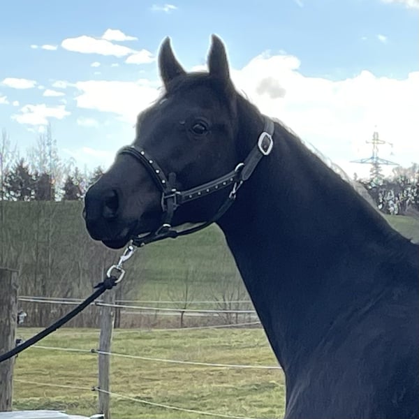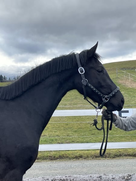 A 3-year-old Oldenburg mare in a striking black coat, directly from the breeder, is available for sale. She combines elegance, expressiveness, and a wonderful temperament. Her noble head, deep black color, and natural presence make her stand out and attract attention. In handling, she is friendly, attentive, and refined, always interested in people and easy to handle in everyday situations. Movement-wise, she possesses everything one would expect from a promising dressage prospect: rhythm, balance, and a harmonious, light-footed mechanics – with great potential for further training. She is a horse that can be built up with patience and sensitivity and is happy to trust her handler. Whether as a future dressage horse, a partner for the ambitious leisure rider, or with an eye on breeding – this young lady offers heart, quality, and potential. A horse for people who want more than just riding, but a real bond.