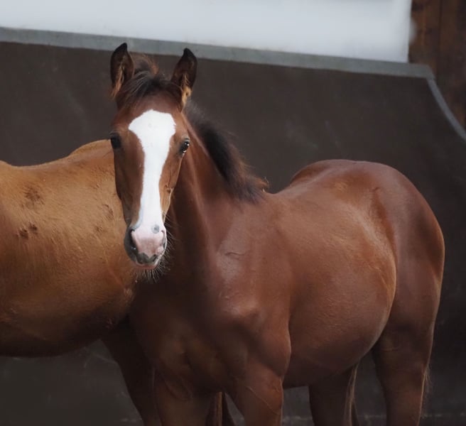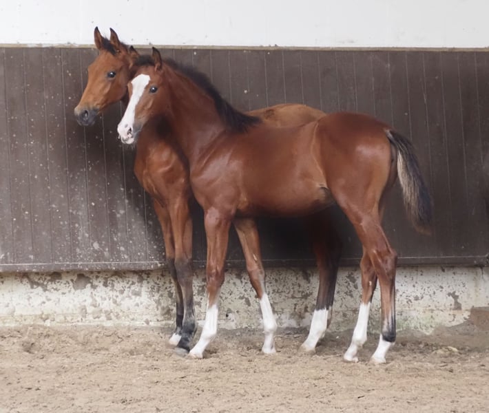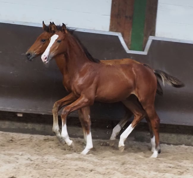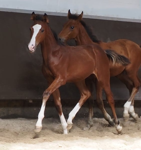 Beautiful colorful double-predisposed filly from proven mating! Mother herself has been successful in amateur sports until S*. Descended from our licensing winner "Cafe au lait", who has been attracting attention for quite some time with his incredibly successful offspring in dressage and show jumping (can also be visited on site). One of the few sires, who can boast several successful offspring in both disciplines up to the advanced class! This is how "Cafe's Casimir" (Cafe au lait x Calido x Grannus) became the celebrated top prize of the Oldenburg Elite Auction, was already a serial winner in dressage horses L and M at a young age, was a serial winner again in his first S dressage at the age of 7 and has now won his first S**! Mare Kasselmanns Cafe's Caletta (Cafe au lait x Calato) has already placed S-dressage and won the International Grand Prix. Cafe's Matts became the second most expensive dressage horse of the Oldenburg Summer Mixed Sales. Other young horses from jumping dam mares have already placed several times in dressage horse tests A and L and are remarkably strong in movement and clear as head. There is no question that the café au lait is convincing offspring in show jumping up to the advanced class. For example, the licensed Cafe's Champus became Vice World Champion of Young Horses under Rene Tebbel and is also in stud use with us. Also licensed and from our breeding: Cafe Junior (Cafe au lait x Silvio I), placed internationally S*-jumping. Cafe au lait himself was a finalist in the National Championships under Philipp Weishaupt and has been successful up to S*** jumping, but has also been equipped with three spectacular GGA and has been trained dressage at S level. Stationed with Paul Schockemöhle, he has already fathered several internationally successful show jumpers, including "Royce", winner of the FEI CSI5* $500,000 Rolex Grand Prix Wellington. Our foals receive daily mineral feed and foal starters, regular EQUISTRO Haemolytan and Ipaligo Foal, worming and blacksmithing are of course also a matter of course. The mothers also receive special mare feed, juice feed, linseed oil and hay ad libitum throughout the pregnancy. So our broodmares and their offspring are always in the best state of health! Other young horses on request, some of them can be found under the other advertisements. Trade-in of suitable broodmare possible. Cafe's Quibelle is already set off and can be visited daily. Video inquiries etc. are only possible via WhatsApp.