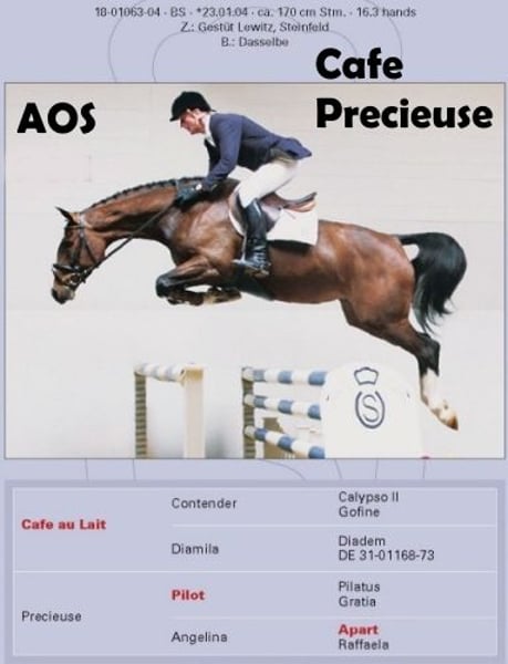 ¡Hermosa, colorida y doblemente talentosa potranca de apareamiento comprobado! La propia madre tuvo éxito en los deportes amateurs hasta S*. Descendiente de nuestro ganador de licencias "Café au lait", que ha estado llamando la atención durante bastante tiempo con su descendencia increíblemente exitosa en doma clásica y salto de obstáculos (también se puede ver en el sitio). ¡Uno de los pocos sementales que puede presumir de tener varias crías exitosas en ambas disciplinas hasta la clase avanzada! "Cafe's Casimir" (Café au lait x Calido x Grannus) se convirtió en el célebre premio más alto de la subasta de élite de Oldenburg, ya era un ganador en serie en caballos de doma L y M a una edad temprana, volvió a ser un ganador en serie en sus primeras clases de doma de nivel avanzado a la edad de 7 años y ahora ha ganado su primer S**! La Caletta (Café au lait x Calato) de Mare Kasselmann ya ha sido colocada en doma de nivel avanzado (S) y sale victoriosa en el Grand Prix internacional. Cafe's Matts se convirtió en el segundo caballo de doma más caro en las ventas mixtas de verano de Oldenburg. Otros caballos jóvenes de yeguas madre saltadoras ya han sido colocados varias veces en pruebas de doma para caballos jóvenes A y L y son notablemente fuertes en movimiento y lúcidos. No hay duda de que los descendientes de Café au lait son convincentes en el salto de obstáculos hasta el nivel avanzado. Por ejemplo, el Cafe's Champus con licencia bajo la dirección de René Tebbel se convirtió en Vice Campeón del Mundo de caballos jóvenes y también está en cría con nosotros. También licenciado y criado a partir de nuestra ganadería: Café Junior (Café au lait x Silvio I), colocado internacionalmente en salto de obstáculos avanzado (S*). El propio Cafe au lait fue finalista en el Campeonato de Alemania bajo la dirección de Philipp Weishaupt y ha tenido éxito hasta el salto de obstáculos S***, pero también ha sido equipado con tres GGAs espectaculares y ha entrenado doma clásica a nivel avanzado. Estacionado con Paul Schockemöhle, ya ha engendrado varios saltadores de éxitos internacionales, incluido "Royce", victorioso en el FEI CSI5* $500,000 Rolex Grand Prix Wellington. Nuestros potros reciben diariamente piensos minerales y iniciadores de potros, los potros EQUISTRO Haemolytan e Ipaligo regulares, los tratamientos de desparasitación y los herreros son, por supuesto, también una cuestión de rutina. Las madres también son alimentadas con alimento especial para yeguas, alimento para jugo, aceite de linaza y heno ad libitum durante todo el embarazo. ¡Así que nuestras yeguas de cría y sus crías están siempre en el mejor estado de salud! Más caballos jóvenes bajo pedido, algunos se pueden encontrar en los otros anuncios. Posibilidad de intercambio de una yegua de cría adecuada. El Quibelle del Café ya ha sido dejado y se puede visitar todos los días. Las solicitudes de video, etc., solo son posibles a través de WhatsApp.