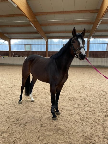Ballerina is an elegant, dark bay mare with plenty of expression and a strong willingness to perform. She is attentive, motivated, and eager to work, impressing especially with her suitability as a show jumping horse. Over fences, she demonstrates good scope, ability, and solid technique. Versatile and adaptable, she performs well both in daily training and in competition. Her pleasant temperament and rideability make her equally appealing to ambitious riders as well as dedicated recreational riders with sporting goals. A stylish all-rounder with clear strengths in the show jumping arena and great potential for the future.