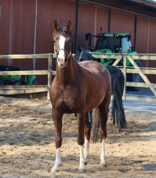A true breeding and dressage gem! Beautiful, modern Oldenburger mare 2019 by Zoom/ Dr. Jackson/Don Cismo/Jazzman/ Donnerhall/Pik Bube with the best dressage dam line of the world – the dam line Finnländerin from starshire Don Schufro ! Exceptional neckline, swinging movements and a lovely character make this young mare to a future winner in the breeding or dressage circuit. A strikingly gorgeous mare for riders and breeders looking for a great dressage prospect or broodmare with excellent movements, a pedigree for rideability, and a wonderful temperament. Mare was broken but not riden the last time (because she should be my new broodmare but we must stop breeding now) . Has had no foals until this time. Video was taken after 3 month under the rider and without hoofshoes Sire Zoom successful up to Grand Prix. Dr. Jackson 14 years under the top 1 % of German breeding . Jazzman also trained up to the highest dressage level and one of the best sons from the Dutch starsire Jazz. Don Cismo also internation successful up to Grand Prix Special. Than comes Donnerhall and Pik Bube in the Pedigree and the dam line is the "line Finnländerin". Ur grand dam is full sister to starshire Don Schufro . Grand dam is sister to proofed breeding stallion, elitemares, winner qualification german horse championship, PSG horses... Is located in Germany by www.dressagehorse-quadriga.com