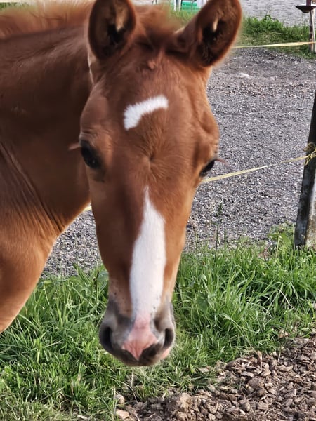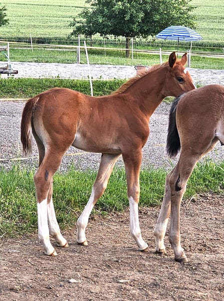 Wegen Zuchtaufgabe und Auslandsaufenthalt ist dieses bildschöne, brave Hengstfohlen v. BENICIO abzugeben sehr gute Gänge, langbeinig und doch knochenstark, elegant, korrekt und mit viel Charme ausgestattet, sehr zutraulich, wird groß, Mutter 176 cm Stm, Vollbruder von 23 bereits 170 cm Stm. Mutter ist auch zu verkaufen, zusammen oder getrennt geb. 5/2025, Dunkelfuchs Oldenburger Stamm 74