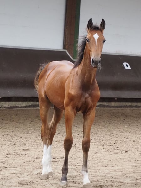 Net zo veelbelovend als zijn volle broer van vorig jaar is deze chique, kleurrijke hengst-nakomeling met een duidelijke dubbele afstamming. Zowel zijn vader Cafe au lait als de moedersvader van de merrie "Quattro B" staan voor veelzijdige vererving en hebben een hele reeks succesvolle dressuur- en springpaarden op gevorderd niveau voortgebracht. Cafe au lait was zelf succesvol tot en met gevorderd (S***) niveau springen, maar heeft ook drie spectaculaire gangen en is opgeleid tot en met gevorderd (S) niveau dressuur. Volle broer van Cody (2002 Bundeschampion van zesjarige springpaarden, ook Pferdezucht Kuhlmann) en zelf een nipt verslagen Bundeschampionat finalist onder Philipp Weishaupt. Hij is gestationeerd bij Paul Schockemöhle en heeft al een aantal internationaal succesvolle springpaarden voortgebracht, waaronder "Royce" (Cafe au lait x Grandilot), die zegevierde in de FEI CSI5* $500,000 Rolex Grand Prix Wellington. Verder de goedgekeurde hengsten Cafe Junior (Cafe au lait x Silvio I), internationaal succesvol in Saoedi-Arabië, Chester (Cafe au lait x Orlando van de Heffinck) en Cafe's Champus (Cafe au lait x Calido I, Vice Wereldkampioen Jonge Paarden onder Rene Tebbel). De meest recent goedgekeurde hengsten zijn Cafe's Columbo (Cafe au lait x Belstaff), succesvol in Frankrijk, en Cafe's Don Rubi (Cafe au lait x Donnerhall), bij ons gestationeerd. Cafe's Casimir" (Cafe au lait x Calido x Grannus) was een gevierde topprijswinnaar op de Oldenburg Elite Auction, was op jonge leeftijd seriewinnaar in de elementaire en medium dressuurpaardensport, was op 7-jarige leeftijd opnieuw seriewinnaar in zijn eerste dressuurwedstrijden op gevorderd (S) niveau, en is nu winnaar in S** en CDI3* FEI Intermediaire I. Cafe's Caletta (Cafe au lait x Calato) wint momenteel dressuurwedstrijden voor gevorderden (S**) en vergevorderden (S***) onder Bianca Kasselmann. Cafe's Matts (Cafe au lait x Don Frederico) was het op één na duurste dressuurpaard op de Oldenburger Summer Mixed Sales. Andere jonge paarden uit springgeoriënteerde merries hebben zich al meerdere keren geplaatst in proeven voor jonge dressuurpaarden van beginnend tot middelmatig niveau en zijn opvallend sterk bewegend en nuchter. Alle wegen liggen dus open voor dit fantastische veulen! Onze veulens krijgen dagelijks mineraalvoer en veulenstarter, regelmatig EQUISTRO Haemolytan en Ipaligo Foal, ontwormen en een hoefsmid zijn ook vanzelfsprekend. De moederdieren krijgen ook speciaal merrievoer tijdens de dracht, dagelijks sapvoer en lijnzaadolie, en hooi ad libitum. Dit zorgt ervoor dat onze nakomelingen altijd in optimale gezondheid verkeren! Videovragen etc. kunnen alleen van tevoren worden gedaan via WhatsApp. Verdere veulens en jonge paarden uit ons eigen fokprogramma op aanvraag, sommige zijn te vinden onder de andere advertenties.