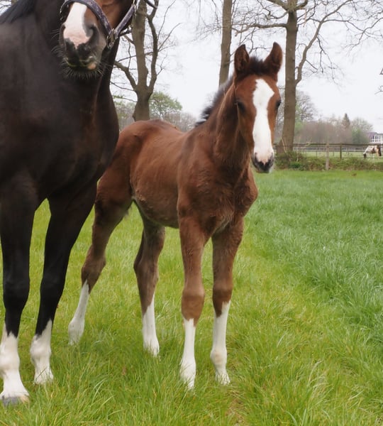 Beautiful colorful Totilas grandson with recognition value!!! 4x bright white with wide blaze! Drawn as if painted, he already attracts everyone's attention! Dam herself placed in novice and elementary level dressage tests until she switched to breeding. His sire Cafe au lait, winner of his licensing, HLP winner and BuCha finalist, was himself victorious in the advanced classes and has made a name for himself in recent years as a double sire with top offspring. Cafe's Casimir" (Cafe au lait x Calido x Grannus) was the celebrated top prize winner at the Oldenburg Elite Auction, is a serial winner in advanced (S) level dressage competitions at a young age and has won Intermediaire I internationally. Kasselmann's mare Cafe's Caletta (Cafe au lait x Calato) has also already placed in advanced (S) level dressage and won international Grand Prix competitions. Cafe's Matts (Cafe au lait x Don Frederico) was the second most expensive dressage horse at the Oldenburg Summer Mixed Sales. Other young horses out of jumping-oriented broodmares have already been placed several times in tests for young dressage horses at advanced (A) to medium (M) level and are remarkably strong-moving and clear-headed. There is no doubt that the Cafe au lait offspring are convincing in show jumping up to advanced level, for example from our breeding program: Cafe's Champus: licensed, Vice World Champion for young horses Cafe Junior: licensed, internationally successful in Saudi Arabia Cafe's Columbo: licensed and successful in sport in France Cafe's Don Rubin: licensed, 4 years old, as youngest horse bronze at the Dobrocker Deisterchampionat Stationed at Paul Schockemöhle, Cafe au lait has already sired a number of internationally successful show jumpers, including "Royce", victorious in the FEI CSI5* $500,000 Rolex Grand Prix Wellington. Cafe au lait himself was a Bundeschampionat finalist under Philipp Weishaupt and has been successful up to advanced (S***) level in show jumping, but also has three spectacular GGAs and has been trained to advanced (S) level in dressage. Our foals receive daily mineral feed and foal starter, regular EQUISTRO Haemolytan and Ipaligo Foal, worming and a farrier are also a matter of course. The dams also receive special mare feed throughout their pregnancy, daily juice feed and linseed oil, as well as hay ad libitum. This ensures that our offspring are always in the best of health. Further foals and offspring from our own breeding on request. There are always a few broodmares in foal for sale. Video requests etc. only possible in advance via WhatsApp!