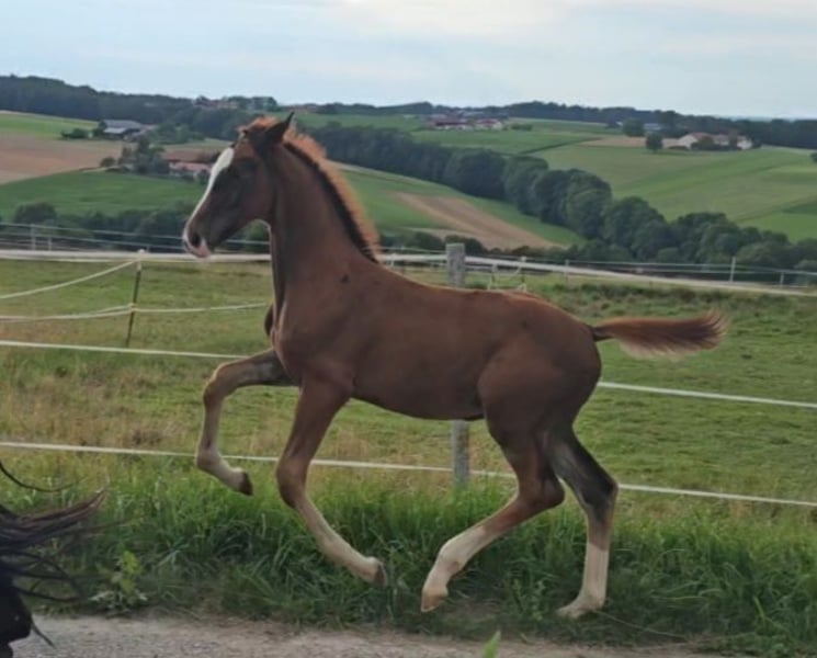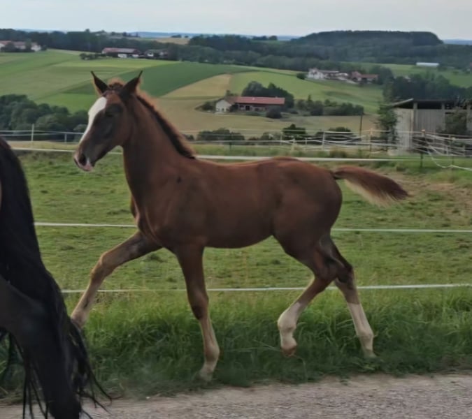 Bildschöner Hengsttyp ! Überragende lockere Bewegungen , Tolle Bergaufgaloppade. Der Hengst wird sehr gross ! Geboren am 1.5.24. Wegen Aufgabe der Dressurpferdezucht verkaufen wir diesen Superstar.
