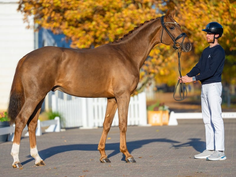 Fynch Hatton/Ampere (NLD)/Fidertanz Dieser in moderner Dunkelfuchsilhouette gekleidete Fynch Hatton-Sohn präsentiert sich mit einem imposanten Bewegungsablauf. Auch im Schritt mit viel Raumgriff und gelassen schreitend sowie mit exzellentem Interieur ausgestattet sicher eine interessante Offerte für Zucht und Sport. Vater Fynch Hatton war Siegerhengst der Oldenburger Sattelkörung und 4-jährig qualifiziert für das Bundeschampionat. Ein Garant für schicke und bewegungsstarke Nachkommen. Erfolgsdaten: V: 35TT (DNK) Schwerpunkt Dressur 8,49; RPF siegr., Bundeschampion 4jähr. RPF-Hengste/DPF L siegr.; lt. FN 7 gekörte Söhne, NK hocherfolgr. in Aufbauprüfungen M: MM: DPF A siegr.; 1 sporterfolgr. NK: Vincenza 7 (v. Vitalis) DPF L siegr./DPF M erfolgr. MMM: 3 sporterfolgr. NK u.a.: Cherrie 220 (v. Romanov Blue Hors) RPF siegr., Fabulous Fritzi (v. Fürst Wilhelm) DPF A/DRE A* erfolgr. Hannoveraner Stutenstamm 5190407 (Cena) gekörte Hengste: Herannus (v. Grannus) SPR 140cm erfolgr., Twilight (v. Toulon) SPR intern. 140cm erfolgr., Caretinus K (v. Carenaro), Granilli S (v. Grannus), MDH Welt Hill (v. Welt Hit II) DRE intern. GP erfolgr., Fascination Pur (v. Fürst Fugger) DRE S* erfolgr., Welt Hit I O (v. Weltmeyer) DRE GP erfolgr., Welt Hit II (v. Weltmeyer) DRE S* erfolgr., Welt Hit III (v. Weltmeyer) DRE S* erfolgr., Welt Hit IV (v. Weltmeyer) DRE IM I erfolgr., Welt Hit VI (v. Weltmeyer) DRE IM I erfolgr., Tullamore (v. Torero) DRE GP erfolgr. erfolgr. Springpferde: Clincini Z (v. Clintissimo Z) SPR intern. 140cm erfolgr., Captain Jack Z (v. Carrera VDL) SPR intern. 140cm (CSIYH) erfolgr., Aron 63 (v. Argentinus) SPR 140cm erfolgr., Quite Easy 4 (v. Quidam’s Rubin) SPR intern. 160cm erfolgr., Zeppelin 16 (v. Zapateado) SPR 140cm erfolgr., Giorgio Armani 13 (v. Grandeur) SPR 150cm erfolgr., Chamonix de Reve (v. Nabab de Reve) SPR intern. 140cm erfolgr., Emmes 5 (v. Emerald van het Ruytershof) SPR 140cm (USA) erfolgr., Perselys (v. Caspar) SPR intern. 145cm erfolgr., Nobbi 10 (v. Nabab de Reve) SPR intern. 145cm erfolgr., Malito (v. Malito de Reve) SPR intern. 150cm erfolgr., Star Breaker (v. Stakkato Gold) SPR intern. 145cm erfolgr., Columbus 104 (v. Colestus) SPR 140cm erfolgr., Vegas 62 (v. Vigo d’Arsouilles) SPR intern. 145cm erfolgr., Apollo CM (v. London) SPR 140cm erfolgr., Call Me Cool Z (v. Clinton I) SPR intern. 140cm (CSIYH) erfolgr., Viper Z (v. Vigo d’Arsouilles) SPR intern. 150cm erfolgr., Zap Along (v. Zapateado) SPR 140cm erfolgr., Zillion (v. Zapateado) SPR intern. 140cm erfolgr., Zerafina (v. Zapateado) SPR intern. 145cm erfolgr., Zeus Valencie (v. Marius Claudius) SPR intern. 145cm erfolgr., Libori (v. Libero H) SPR intern. 140cm erfolgr., Darling Bleu (v. Mr. Blue) SPR intern. 140cm erfolgr. erfolgr. Dressurpferde: Life Style 12 (v. Levantos I) DRE S* erfolgr., Rosette B (v. Romanov) DRE intern. IM I erfolgr., Dark Diva (v. Don Frederico) DRE PSG (USA) erfolgr., Acilla (v. Florencio I) DRE PSG (USA) erfolgr., Die Callas (v. De Niro) DRE intern. GP erfolgr., Rubin de Luxe OLD (v. Rubin-Royal) DRE GP erfolgr., Mc Queen 5 (v. Morricone I) DRE intern. Junge Reiter-Tour erfolgr., Chere Celine OLD (v. Governor) DRE intern. IM I erfolgr., Rubin de Luxe OLD (v. Rubin-Royal) DRE GP erfolgr., Charming Sezana (v. SezaunI DRE IM II/DRE intern. PSG erfolgr., Beltano (v. Belissimo M) DRE intern Junioren-Tour erfolgr., Beltario (v. Belissimo M) DRE intern. IM I/DRE intern. Junioren-Tour erfolgr., London Rock (v. Londonderry) DRE IM I erfolgr., Cilla Francesca CF (v. Franziskus) DRE PSG (USA) erfolgr., MW Marcario (v. Morricone I) DRE IM I (USA) erfolgr., Donner Hit OLD (v. Donner Hit) DRE intern. GP erfolgr., Santa Cileste (v. San Amour I) DRE S* erfolgr., Rudolph 17 (v. Rosario) DRE IM II erfolgr., Zenario (v. Zonik) DRE intern. Junge Reiter-Tour erfolgr., Fina Ragazza (v. Fürst Romancier) DRE S* erfolgr. erfolgr. Vielseitigkeitspferde: Every Chico Son (v. Chico’s Boy) Viels. intern. CCI3*-S erfolgr. Ansprechpartner: Jannes Sonnenberg 01705417431