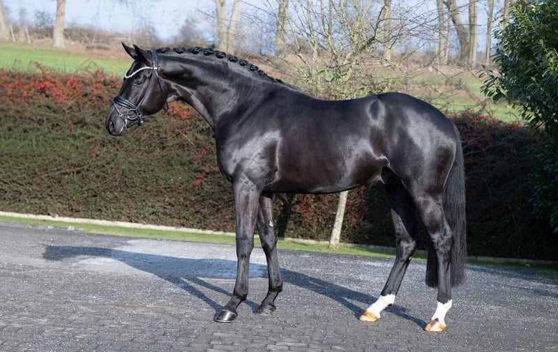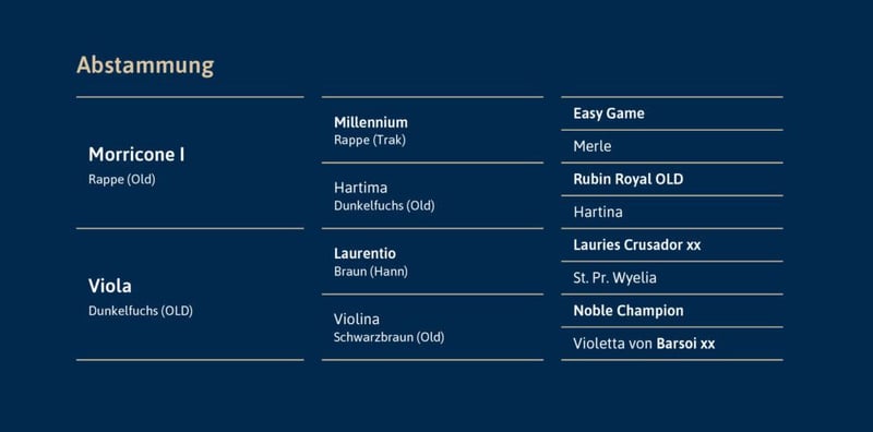 von Morricone I – Laurentio zugelassen für Oldenburg, weitere auf Anfrage WFFS-frei Röntgenprotokoll unter www.hof-thelker.de Züchter: Ralf Toellner Decktaxe Frischsamen: 300 € bei Besamung + 500 € bei Trächtigkeit (zzgl. USt.) Jungzüchterrabatt! Züchtern bis 30 Jahre gewähren wir 30% Rabatt! Weitere Informationen bei Christian Thelker +49 175-854 3529 oder Karl-Heinz Hooghoff +49 170 4450576 Mit Mai Tai präsentiert sich ein edler Junghengst mit viel Schmelz und Adel. Die ersten Eindrücke unter dem Reiter lassen Großes erhoffen, besonders sein aktives Hinterbein und sein gelassener Schritt bestechen. Am meisten fasziniert sind wir aber von seinem traumhaften Charakter und seiner vorbildlichen Arbeitseinstellung. Bei seinem Veranlagungstest begeisterte Mai Tai die Richter und Fremdreiterin mit seiner Leistungsbereitschaft und den überdurchschnittlichen Rittigkeitswerten. Morricone I – der Vater Sein Vater, Morricone I war nicht nur Oldenburger Siegerhengst und Hauptprämiensieger, sondern kann auch sportlich mit Siegen bis Grand Prix aufwarten. Morricone I vereint auf besondere Weise die Vererberheroen Millennium, Rubin-Royal und De Niro mit Typstärke, Leistungsbereitschaft und Grand Prix Veranlagung. Mit über 30 S-erfolgreichen Dressurpferden sowie 24 gekörten Söhnen überzeugt er auch züchterisch auf ganzer Linie. Viola – die Mutter Mütterlicherseits überzeugt Mai Tai ebenfalls mit leistungserprobter Verwandtschaft. Sein Vollbruder „Marokko“ war unter Hope Beerling das erfolgreichste 6-jährige Dressurpferd der USA und konnte 7-jährig bereits internationale Jungpferdeprüfungen gewinnen. Halbbruder Dharkan (v. De Niro) ist unter Léonie Guerra für Liechtenstein mehrfach Grand Prix siegreich. Mutter Viola ist zudem Halbschwester zum gekörten Dolando sowie dem S-Dressurpferd Doktor Haus (v. Don Larino). Großmutter Violetta ist ebenfalls Großmutter zu Viva Waldi, der unter Christine Eglinski auf Grand Prix Niveau erfolgreich ist. Über Barsoi xx und Vollkorn xx im weiteren Pedigree verfügt Mai Thai über einen Edelblutanteil von insgesamt mehr als 45 %!