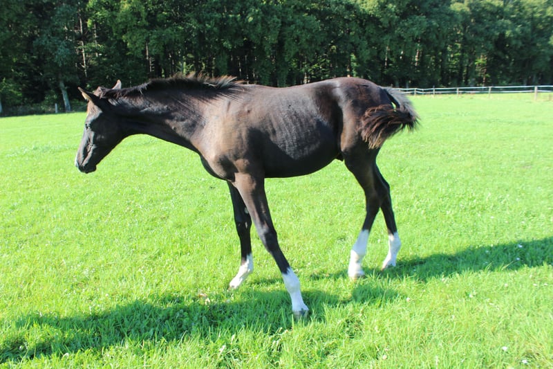 **Sales Advertisement:** For sale is a promising Oldenburg stallion, born in 2025. This elegant black horse impresses with his appealing stature and harmonious movement. The stallion shows great potential. His excellent basic gaits and balanced temperament make him an ideal partner for ambitious riders who are looking for a talented sport horse. He is well-mannered and easy to handle. If you are interested or have any further questions, please feel free to contact me. Visit us and see for yourself this wonderful stallion!