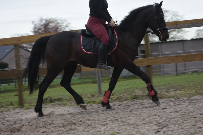 Howi, offiziell getauft mit dem ungewöhnlichen Namen: Howimeturmother, ist ein Schatz von einem Pferd. Früher wurde er bereits im Dressur- und Freizeitbereich eingesetzt und wird bei uns mit viel Freude geritten. Er ist hier sehr kooperativ, sogar ein weniger erfahrener Reiter kann mit ihm reiten. Er hat ein äußerst liebes Wesen. Optisch erinnert Howi stark an einen barocken Friesen. Vor acht Jahren haben wir ihn an ältere Menschen verkauft, die einmal von Feuerwerk in der Nähe der Stallung erschreckt wurden. Jetzt bei uns hat er seine Ruhe wiedergefunden, sowohl im Stall als auch auf der Weide. Sogar ein Anfänger-Kind hat bereits wieder auf ihm geritten. Er besitzt einen Pass mit Stammbaum von From Above x Wall Street Banker. Howi wurde am 16.04.2014 geboren und ist ca. 1,61 m groß. Aktuell liegt ein aktuelles Gesundheits- und Korrekturrapport inklusive Blutprobe vor. Preis: 3.950 € inklusive Markenzäumung.