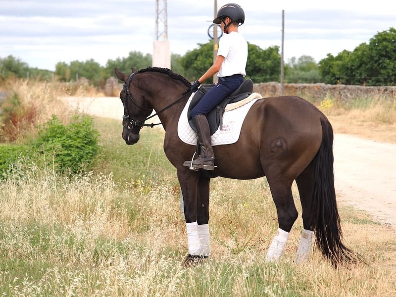 Continuiamo a condividere con voi parte dei nostri prodotti, cavalli allevati con entusiasmo e cura nei pascoli dell'Estremadura come questo puledro nero nato nel 2020 con un'altezza di 163 cm figlio di un cavallo nero PRE, Nazareno Fs, proveniente dalla famosa scuderia Arroyomonte, appartenente a una scuderia leader nell'allevamento di cavalli da dressage, bestiame caratterizzato dalla nobiltà, dalla bellezza e dalla funzionalità dei suoi prodotti. Questo puledro nero è quindi il nipote di Coral XXV, la prima cavalla Pura Raza Española a essere dichiarata Elite. Figlia di Ermitaño III, primo allevatore Elite, e di Isleña XV. La sua madre è una cavalla lusitana albina, pura, ma non registrata, una cavalla molto elegante con buoni movimenti che ha dato il meglio di sé in questo impressionante puledro nero. Morfologicamente è un puledro molto bello, molto robusto sul terreno, con un buon aplomb e un terreno forte, un puledro molto solido e ben fatto, nonostante la sua giovane età è un puledro con una buona conformazione e un buon fisico. La sua andatura è eccezionale, ha una camminata esagerata e i suoi piedi potenti spingono sempre in avanti con molta forza e una buona meccanica. Al momento sta iniziando il suo processo di addestramento, è in sella e all'inizio del suo addestramento mostra un buon carattere e una buona attitudine al lavoro.