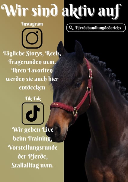 Fandango ist ein 7 Jähriger Wallach ca. 1,62 cm *Fandango* ist ein absolutes Traumpferd. Bildschön super rittig und ganz cool. Er geht schön in der Halle, ist einfach in der Anlehnung und sitzbequem. Er bringt 3 schöne GGA mit. Fandango geht alleine und in der Gruppe ins Gelände sowie in fremder Umgebung ganz unerschrocken. Gelassenheitstraining stellt für ihn auch kein Problem da. Kann auch von schwächeren Reitern oder ängstlichen geritten werden. Er kennt auch Jugendliche und Kinder. !!! SCHAUEN SIE SICH UNBEDINGT SEIN VIDEO AN !!! Im Umgang super lieb, verschmust und unkompliziert. Pferdehandlung Dederichs – Ihr Partner für den Pferdekauf Kontakt & Erreichbarkeit: Anfragen bitte ausschließlich telefonisch unter 0173/9792139 Montag – Freitag: 09:00 – 18:00 Uhr Samstag: 09:00 – 15:00 Uhr Sonntag: Ruhetag Folgen Sie uns auf Social Media! Erleben Sie unseren Alltag mit den Verkaufspferden auf Instagram, TikTok & Facebook unter Pferdehandlung Dederichs Rabatt: Bei sofortiger Mitnahme Ihres neuen Traumpferdes erhalten Sie zwischen 5 %– 10 % Rabatt Probereiten & Vorführen: • Probereiten: 40 € pro Pferd (max. 2 Reiter), Betrag wird beim Kauf angerechnet • Feiertage: Proberitt 50 € • Vorführung durch unsere Bereiter: 30 € pro Pferd (Vorreiten, Bodenarbeit etc.) Ankaufsuntersuchung & Transport: • Viele unserer Pferde besitzen bereits eine AKU • Sie können selbstverständlich Ihren eigenen Tierarzt mitbringen • Gerne organisieren wir eine Untersuchung • Wir unterstützen Sie auch gerne beim Transport ins neue Zuhause Weitere Verkaufspferde: In unserem Stall stehen weitere Verkaufspferde, die noch nicht online sind. Falls Ihr Traumpferd noch nicht dabei ist, zögern Sie nicht, uns zu kontaktieren. Wichtige Hinweise: • Stockmaß-Angaben sind geschätzt und nicht exakt nachgemessen • Alle Beschreibungen sind subjektive Einschätzungen des Verkäufers und keine zugesicherten Eigenschaften
