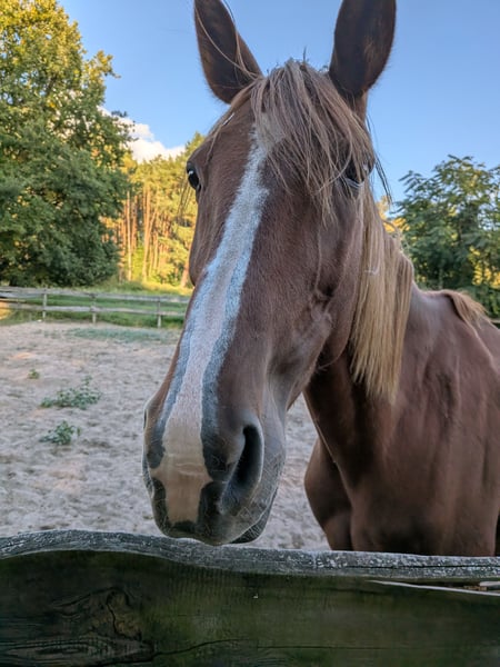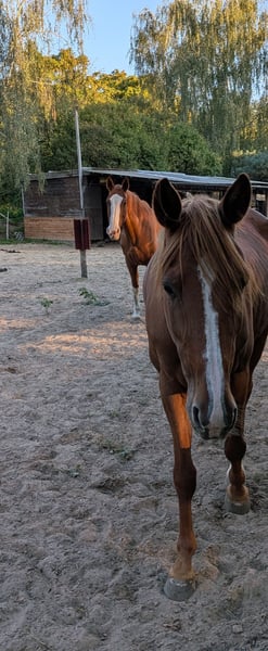 🐴 Gelding "King Oliver" – 9 years old – approximately 15.7 hh – very well-behaved and people-oriented King Oliver is a very gentle, affectionate gelding with an excellent character. He is attentive, friendly, and seeks contact with humans – simply a horse that people enjoy having around. He currently lives in an open stable with a small, mixed herd and demonstrates social and uncomplicated behavior there. In the terrain, he is calm and fearless, also suitable for riding alone. Unfortunately, he is not suitable as a weight carrier, so we are looking for a home with a lighter rider who has the time and joy to further develop him. He has full papers and has received osteopathic care. At present, he still experiences minor difficulties with hoof handling, but these should improve with training and regular treatment. Since we lack an appropriately light and experienced rider here, we have not yet been able to fully realize his potential. We wish for Olli a loving home where he is taken seriously but not overwhelmed.