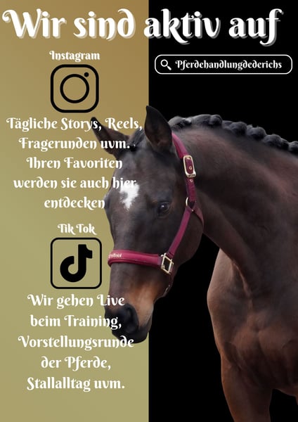 Gringo ist ein 2016 geborener Wallach ca. 1,62 cm v. Fame and Glory, Montjeu x Lavrico, Saint Preul *Gringo* ist ein wunderschöner Allrounder. Er eignet sich super für Schulbetriebe. Gringo geht brav in Bahn und Gelände sowie in fremder Umgebung. Er zeigt auch Freude an Sprüngen. Total verschmust und auch im Umgang sehr lieb. Ein unkomplizierter Wallach mit dem man viel Freude hat und auf dem man sich sehr wohl fühlt. Pferdehandlung Dederichs – Ihr Partner für den Pferdekauf Kontakt & Erreichbarkeit: Anfragen bitte ausschließlich telefonisch unter 0173/9792139 Montag – Freitag: 09:00 – 18:00 Uhr Samstag: 09:00 – 15:00 Uhr Sonntag: Ruhetag Folgen Sie uns auf Social Media! Erleben Sie unseren Alltag mit den Verkaufspferden auf Instagram, TikTok & Facebook unter Pferdehandlung Dederichs Rabatt: Bei sofortiger Mitnahme Ihres neuen Traumpferdes erhalten Sie zwischen 5 %– 10 % Rabatt Probereiten & Vorführen: • Probereiten: 30 € pro Pferd (max. 2 Reiter), Betrag wird beim Kauf angerechnet • Feiertage: Proberitt 50 € • Vorführung durch unsere Bereiter: 25 € pro Pferd (Vorreiten, Bodenarbeit etc.) Ankaufsuntersuchung & Transport: • Viele unserer Pferde besitzen bereits eine AKU • Sie können selbstverständlich Ihren eigenen Tierarzt mitbringen • Gerne organisieren wir eine Untersuchung • Wir unterstützen Sie auch gerne beim Transport ins neue Zuhause Weitere Verkaufspferde: In unserem Stall stehen weitere Verkaufspferde, die noch nicht online sind. Falls Ihr Traumpferd noch nicht dabei ist, zögern Sie nicht, uns zu kontaktieren. Wichtige Hinweise: • Stockmaß-Angaben sind geschätzt und nicht exakt nachgemessen • Alle Beschreibungen sind subjektive Einschätzungen des Verkäufers und keine zugesicherten Eigenschaften