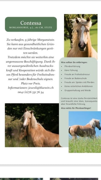 Tolle und sehr fleissige Stute mit viel Begeisterung an der Zusammenarbeit. Sei dies auf langen Ausritten, Dressur oder Springarbeit, sehr gerne Bodenarbeit oder gar Zirkuslektionen, Naturhindernisse, Horse Trail, Gymkhana und vieles mehr. Immer mit Begeisterung dabei! Sicherlich jedoch kein reines Spring oder Dressurpferd. Sie ist gruppentauglich, hat ein gutes Selbstbewusstsein und wünscht sich zumindest einen Freilaufstall, noch besser gerne in Gruppe. Contessa ist eine starke Persönlichkeit, fein zu reiten an allen Hilfen und will immer gefallen. Sie wird aus erster Hand abgegeben, dies aus persönlichen Gründen einer veränderten Lebenssituation. Sie wurde mit 6 Monaten von Ihrer jetzigen Besitzerin gekauft, und wurde schonend fein ausgebildet. Contessa hat während ihrer ganzen Ausbildung und bis heute, keinerlei Unarten wie Bocken, Steigen oder Durchbrennen gezeigt. Trotzdem fehl es Ihr keineswegs an Drive, sie marschiert immer fleissig! Wir suchen für Sie Ihren Herzensmenschen, mit dem Sie durch dick und dünn tanzen darf. Kein Schulpferd!