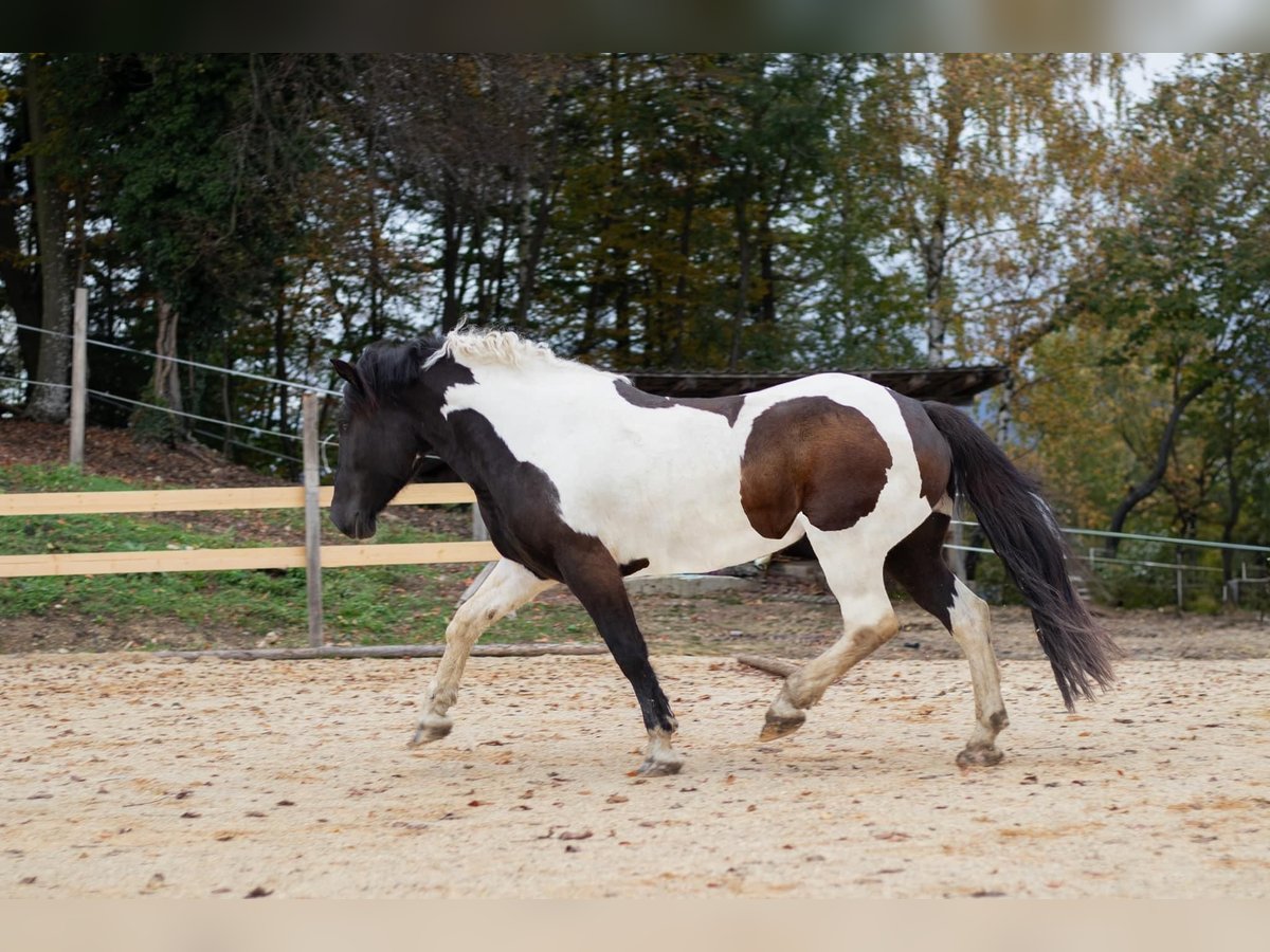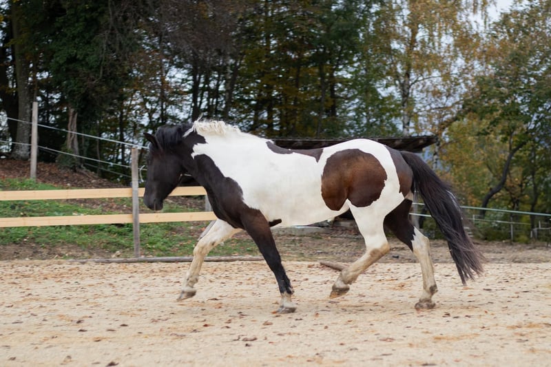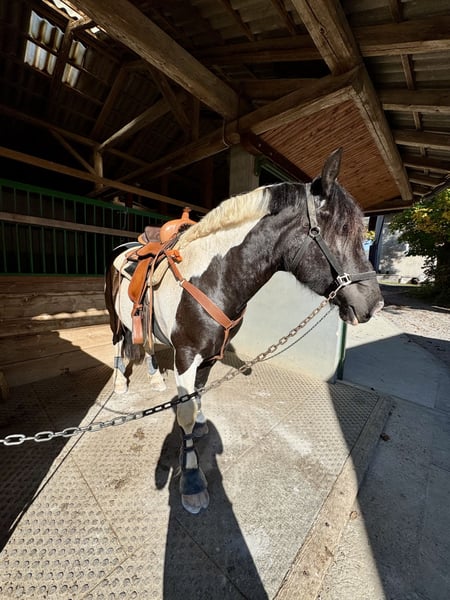 Beautiful Pinto Mare for Sale – Perfect for Classical Dressage or Western riding! Standing at 155 cm, she combines a graceful appearance with a promising athletic build. With her striking coat pattern, she is sure to turn heads wherever she goes. This mare has been sound and well cared for (she lives 24/7 in pastures). Her training started with the principles of Classical Dressage, therefore I would love to see her in a home that will continue to develop her in this direction. She is used to riding in Western and English tack. She is truly a mare with the biggest heart, therefore I’m not in a hurry with the sale and I only want the best home for her. The price INCLUDES her full tack (English and Western).