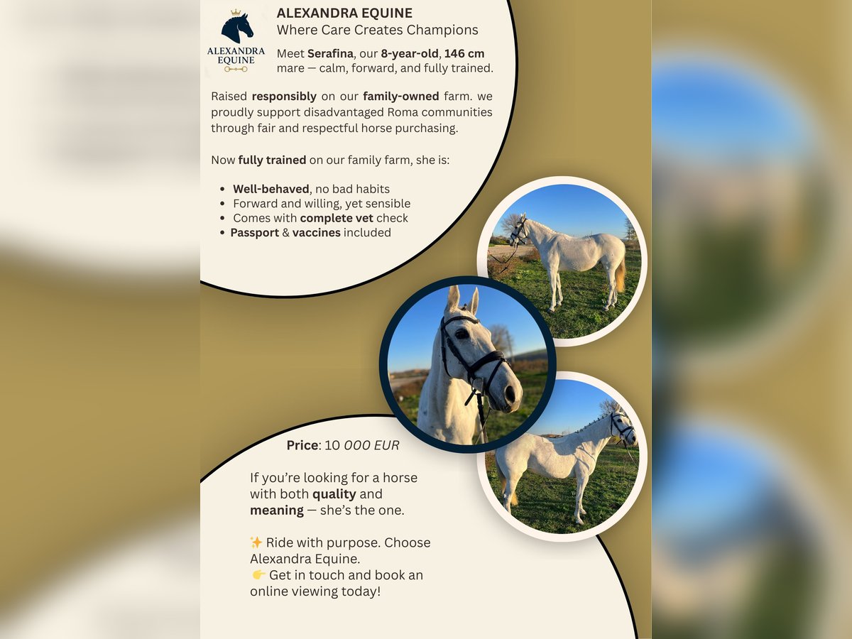 This is an exceptional, purebred Karakachan horse – a rare and ancient autochthonous breed from the mountains of Bulgaria. True to her heritage, this mare is a prime example of the breed’s legendary hardiness, intelligence, and sure-footedness. Characteristics & Temperament: She possesses a strong and steady character, combining self-assurance with a very loyal and cooperative work ethic. She is exceptionally brave and composed in challenging environments, making her a reliable partner. Endurance & Long-Distance Suitability: Built for the most demanding conditions, this breed is world-renowned for its extraordinary stamina. She is an ideal candidate for endurance riding or long-distance trail hacking, as her metabolism and bone density are optimized for sustained performance over rugged terrain. Level of Training & Abilities: - Professional Training: She is well-schooled in all three paces (walk, trot, canter), demonstrating balance and responsiveness. - Jumping: She is safe and confident over jumps, showing good focus and willingness for smaller competition classes or leisure show jumping. - Versatility: An elite choice for equestrian tourism, her inherent sure-footedness ensures safety across uneven landscapes. Social Impact: By choosing this horse, you are also supporting a meaningful social cause, as she was raised on a farm that proudly partners with disadvantaged Roma communities through fair and respectful horse purchasing practices. Further Characteristics: - Hardiness: An easy keeper with an excellent constitution and robust health. - Suitability: Perfect for an ambitious rider seeking a versatile, high-endurance mount with a unique history and social meaning.