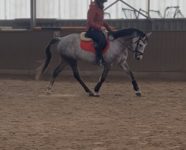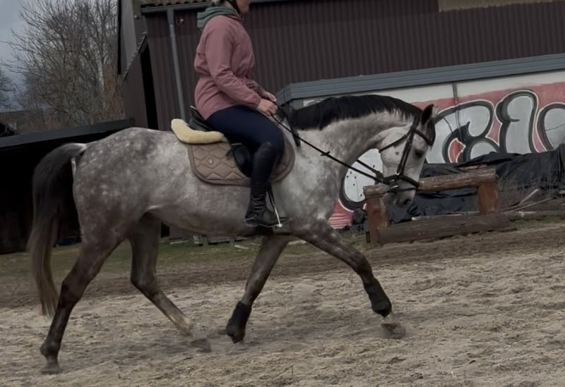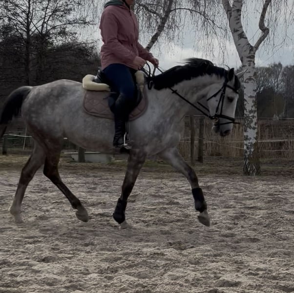 De merrie is 9 jaar oud (*2017, schofthoogte ca. 155 cm), zeer gevoelig, intelligent en alert. Ze heeft een rustige, duidelijke begeleiding en consequente training nodig. Door een scheur in het ondersteuningsband en mijn daaropvolgende zwangerschap heeft ze langere tijd op de wei gestaan en is pas in 2024 voorzichtig begonnen met rijden. Haar opleidingstechnische ontwikkeling is daardoor niet volledig op haar leeftijd afgestemd. Bij onzekerheid toont ze snel spanning, waardoor ze niet geschikt is voor beginners.