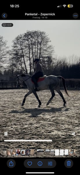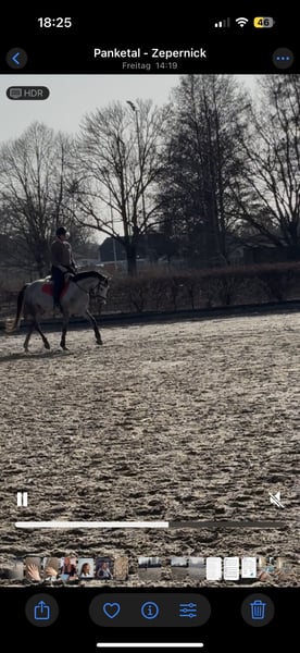 Die Stute ist 9 Jahre alt (*2017, Stockmaß ca 155 cm), sehr sensibel, stutig und schlau und benötigt daher eine ruhige, klare Bezugsperson und konstante Arbeit. Durch einen Riss im Unterstützungsband und meine darauf folgende Schwangerschaft stand sie auch nach der Auskurierung noch länger auf der Wiese und wurde erst 2024 schonend angeritten. Entsprechend ist sie ausbildungstechnisch nicht altersgemäß gefestigt. Bei Unsicherheiten zeigt sie schnell Spannung, weshalb sie nicht für Anfänger:innen geeignet ist.