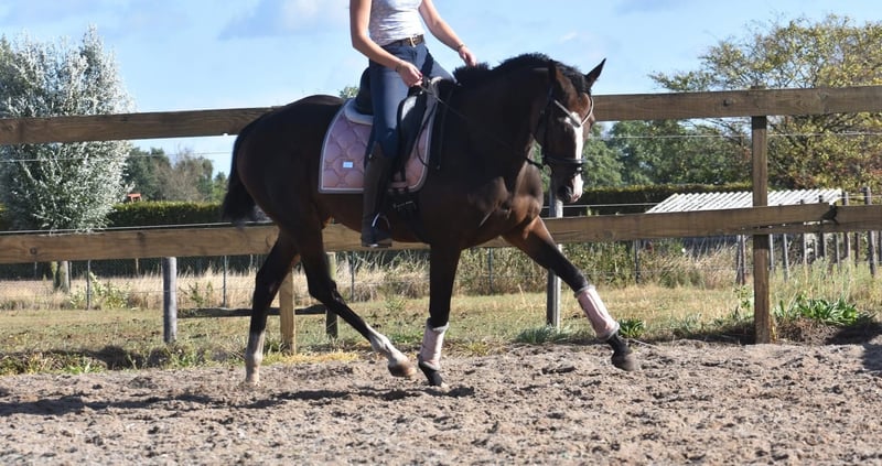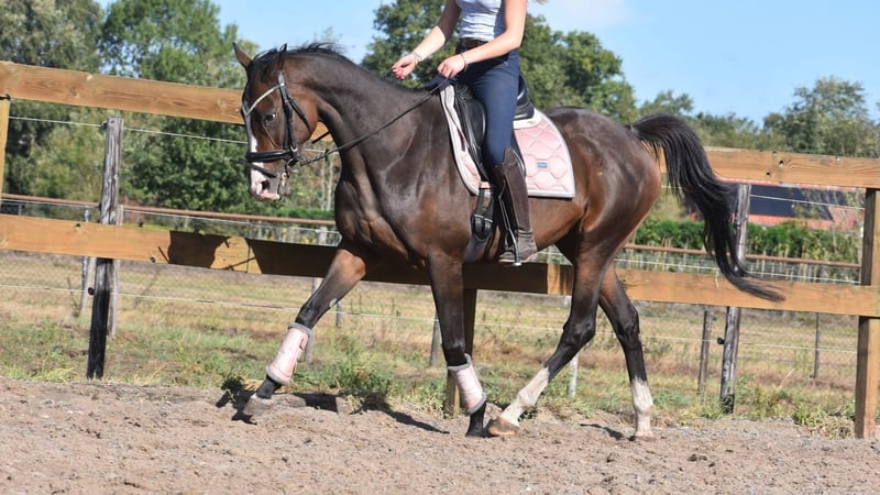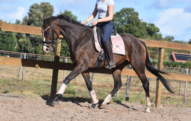 Tête d'affiche : cheval de dressage correct, honnête et fiable, 9 ans Paddy est une jument de 9 ans d'environ 1,62 m au garrot, issue d’un pedigree Leading Light x Caoba par Hernando (FR). Elle possède une silhouette élégante mais robuste, avec de belles longues jambes, et se laisse monter agréablement. Paddy n’est en aucun cas paresseuse et aime travailler pour son cavalier. Elle a une bouche douce et réagit bien aux aides. Il n’est absolument pas nécessaire d’avoir une main lourde avec elle. Paddy est calme en société, en bonne santé et sans défauts. Elle est également très intéressante pour l’élevage ! Récemment, elle a été également traitée chez le vétérinaire-dentiste. Prix : 5950 € incluant une selle de marque et une couverture.