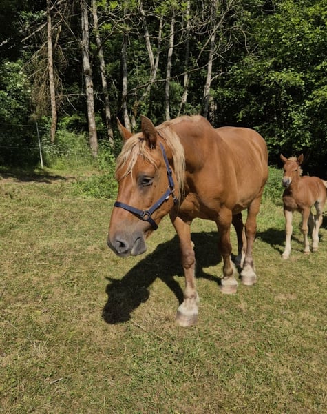 Trait Comtois Mare with Filly at Foot – with Pedigree For sale is the 11-year-old Trait Comtois mare Etoile du Ruchard. She is a registered breeding mare and has complete pedigree papers. Etoile du Ruchard is currently with a filly at foot. The filly was born in June 2025, is currently 3 months old, and has full pedigree. A covering certificate is available for the filly. The foal is healthy and developing very well for its age!!! The mare was used by the previous owner both as a driving horse and as a riding horse. She is strong, breed-typical, and offers a solid foundation for breeding, leisure, or work in harness. Details at a glance: Breed: Trait Comtois Mare, 11 years, Name: Etoile du Ruchard Height: 168 cm Registered breeding mare with pedigree Filly at foot, born 06/2025, with full pedigree and covering certificate Previous use: Driving & Riding Currently on rest due to the foal!!! This means the mare is not being worked at the moment!!! Image 4: Pedigree of the mare Image 5: Pedigree of the foal Viewing possible at any time by appointment. Further information available upon request.