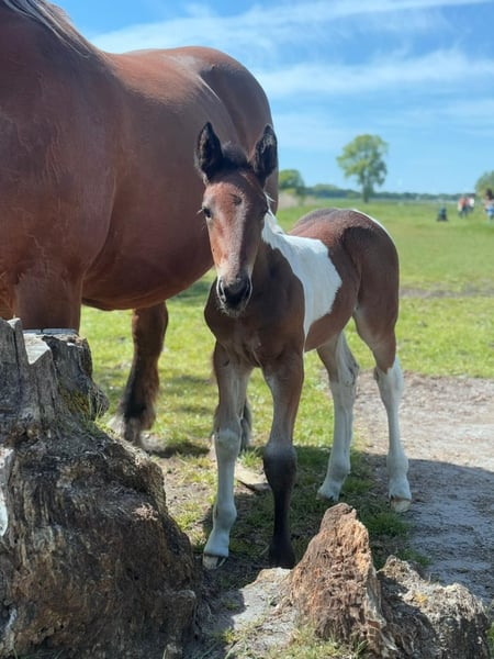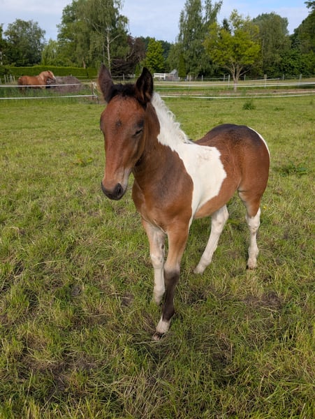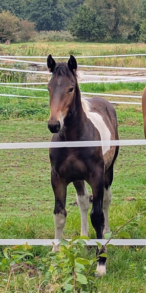 Our lovely Katinka, born on May 4th, 2025, is looking for a caring forever home. With her striking brown and white coat, her sturdy build, and her calm, people-oriented nature, she is truly a heart horse. 💕 Name: Katinka Date of Birth: May 4th, 2025 Gender: Mare Breed: Coldblood Cross (Mother: Comtois, Father: KWPN) Color: Brown and white pinto Approximate Height: 16.1–16.3 hh Temperament: Friendly, curious, balanced, and well-behaved around people Katinka is raised appropriately in an open stable environment within a small herd. She is familiar with halter, grooming, hoof care, and regularly sees the farrier. She is an excellent young horse for leisure riding, driving, or later under saddle.