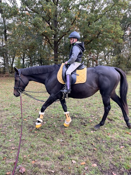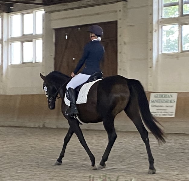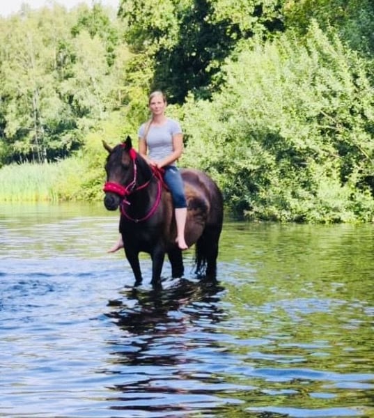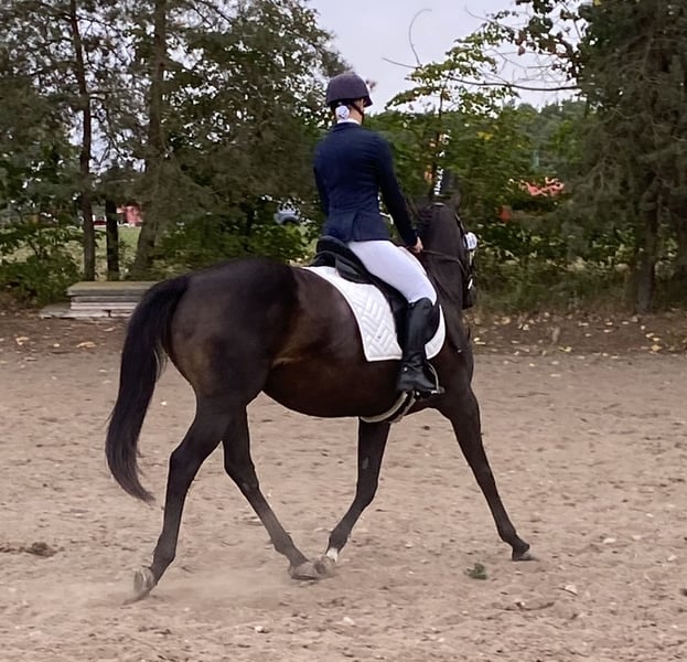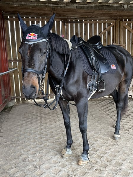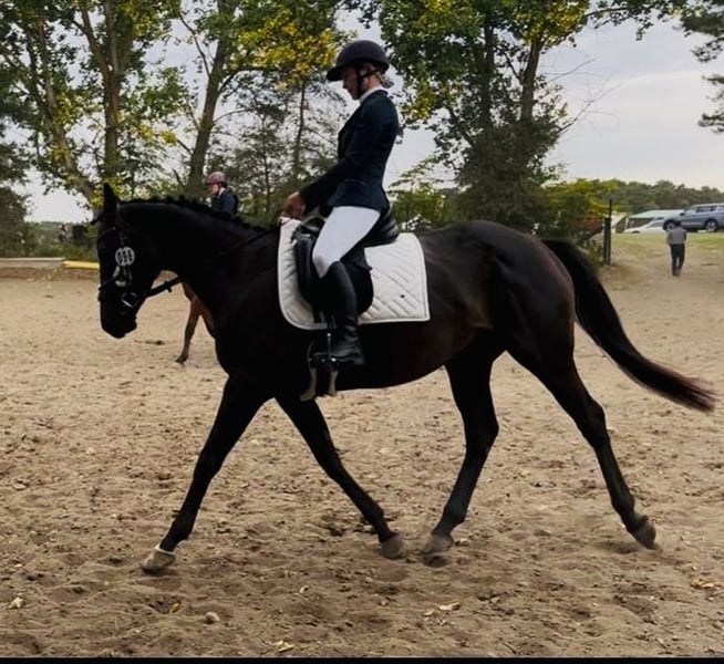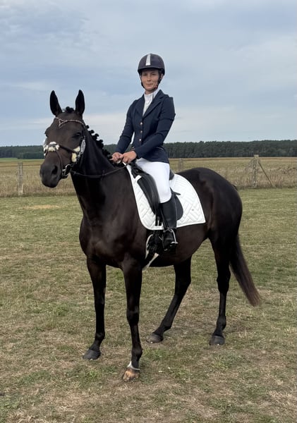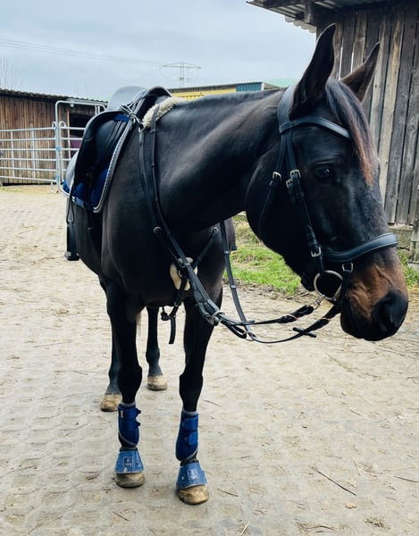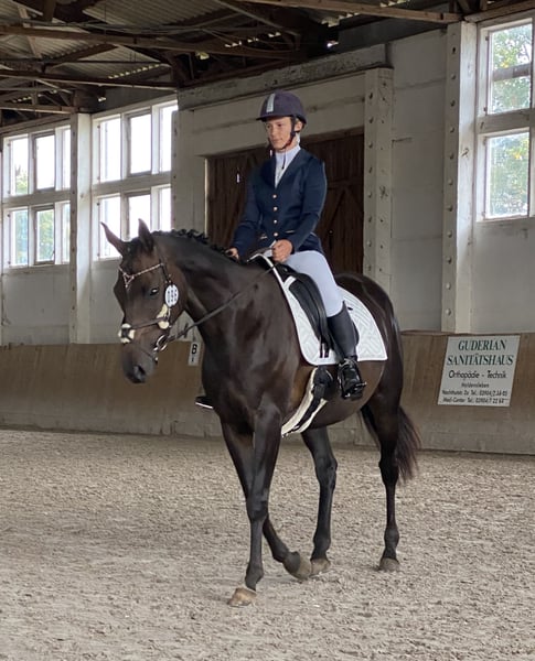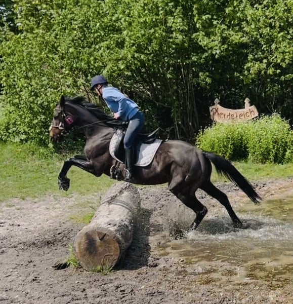Ich gebe meine Stute Hope ab. Hope wird im April 6 und ist 160 groß. Sie wird Dressurmäßig ausgebildet und läuft sicher alle Gangarten , sowie Schenkelweichen in allen Gangarten,Schulterherrein,Seitengänge und Außengalopp angefangen. Im Gelände ist sie Sicher und Selbstbewusst, läuft artig auch im Straßenverkehr, Trecker , Lkw Autos sind kein Problem für sie. Ob allein oder in der Gruppe. Hope ist ein sehr fleissiges Pferd mit Go, aber kein Durchgänger. Longe, Doppellonge, oder Kinder an der Longe im Unttericht klappt super, auch im Dressur Unterricht können Kinder oder Anfänger sie frei reiten. Trotzdem ist sie kein reines Anfänger Pferd . Hope kennt es regelmäßig zum Training , Lehrgänge, Ausritte etc. Weg zu fahren. Sie steigt allein in den Hänger und man kann sie problemlos allein verladen. Sie kennt Wasser und geht auch problemlos in allen Gangarten durch , sowie rein oder raus Springen aus dem Wasser. Sie springt sehr gerne wurde aber die letzten Monate nicht weiter gefördert, sie wird Heiß beim Springen und braucht dort eine sichere Person ohne Angst. Tunierluft hat sie schon geschnuppert im springen und der Dressur . Hope ist Tunierpferde eingetragen und dementsprechend auch Geimpft , regelmäßig ihr Zähne gemacht und Osteophatisch behandelt, ebenso alle 8 Wochen dem Schmied vorgestellt und ist vierfach beschlagen. Sie kennt Offenstall und Boxenhaltung . Fühlt sich im Offenstall aber deutlich wohler