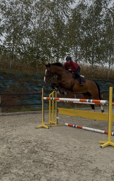For sale: a beautiful gelding, born in 2009, standing 173 cm at the withers. He is a Hanoverian (note: the breed cannot be selected in the listing) with a bay coat and distinctive markings on his head, belly, and legs. He has excellent jumping potential and is an ideal choice for both experienced riders and those just starting their equestrian journey. He is especially suitable for a younger or less experienced rider — he has been ridden for many years by young girls. The horse is healthy and very well cared for. He is under constant supervision of a physiotherapist, saddle fitter, veterinarian, blacksmith, etc. No issues with his hooves or saddle. He has a “teddy bear” type personality. Despite his age, he is in great shape! Ready to continue competing in show jumping. He has not had any injuries. Possibility of performing a TUV (veterinary examination on-site). He has been trained up to N1 level at home and has previously competed in C-class events. He can be sold with the saddle and/or other equipment! VAT invoice available (€58,000). Please feel free to contact me for additional information or to arrange a free trial ride. This is a unique opportunity to acquire a healthy, safe, and friendly companion for many years!