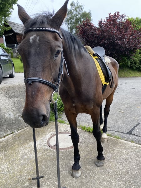 Verkaufe Warmblut-Wallach – Ideal für die Freizeit! Zum Verkauf steht ein hübscher Dunkelbrauner Warmblut-Wallach, geboren im Jahr 2004. Mit einem Stockmaß von ca. 170 cm bietet er die perfekte Größe für einen vielseitigen Freizeitpartner. Der liebe alte Herr genießt die gemeinsame Zeit mit seinem Menschen sehr und liebt es bedüdelt zu werden. Er wurde damals in der Dressur gut ausgebildet und am Platz zu reiten, liebt er und macht er richtig brav. Beim Ausreiten allerdings kann er oft sehr guckig sein, was aber in der Gruppe besser ist als alleine-er wird aber nie böse dabei. Lange Ausritte macht er trotz seines Alters auch noch sehr brav mit. Leider lässt es meine familiäre Situation nicht mehr zu ihn zu behalten und ich kann ihm nicht mehr gerecht werden. Wäre schön, wenn es jemanden gibt, der Freude daran hätte mit ihn noch etwas zu Arbeiten oder ihn einfach lieb zu haben und Bodenarbeit/Spaziergänge zu machen. Bei Interesse oder weiteren Fragen stehe ich Ihnen gerne zur Verfügung. Zubehör kann natürlich auch dazu erworben werden. Platz vor Preis!