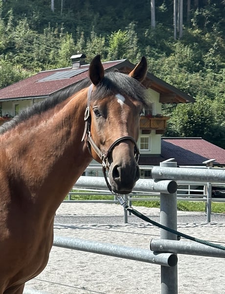 We are looking for a loving new home for our lovable Brooklyn, a 4-year-old brown Warmblood gelding with a height of approximately 169 cm, where he can receive dedicated support. Brooklyn is very well started under saddle and impresses with three above-average basic gaits as well as a great attitude towards daily work. He also shows a lot of talent and overview in jumping, making him suitable for eventing, show jumping, or dressage. Additionally, he has been driven in a pair and demonstrates absolute reliability in this discipline as well. He is very rideable, people-oriented, and has a wonderful, honest character – always eager to do everything right. This makes him not only a sportingly interesting young horse but also a true partner for ambitious leisure riders or those looking to start in competition riding. If you are seriously interested, we look forward to your message or call. Trial rides can be arranged by appointment.