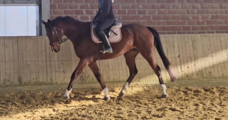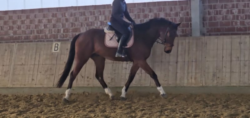 Rusty is an approximately 16.1 hh charming gelding, and he will likely still grow another 1-2 cm. He has good, solid conformation, and what truly stands out about him is his fine riding sensitivity. He is an automatic horse. :-) Rusty is a great all-rounder for all disciplines of riding. Just mount up and feel at ease. In handling, he is a spirited type, a true gelding. He is always alert and eager to play with everything, carrying around various objects. :-) Rusty can sometimes be quite the clown. Otherwise, he is a robust little fellow who is accustomed to open stalls, 24-hour turnout, and box stall management with pasture time. Rusty has a current veterinary examination with no findings. For more information, please call: 0177/2721831. If you are interested in videos, kindly contact us exclusively via WhatsApp.