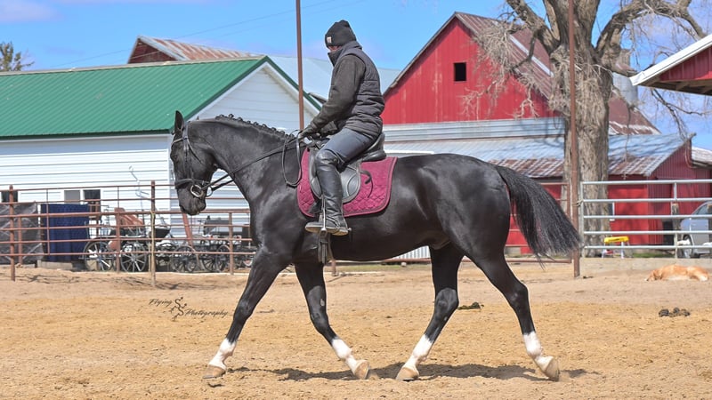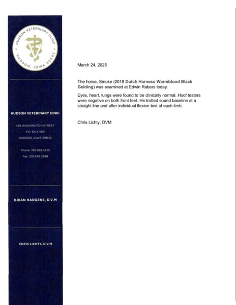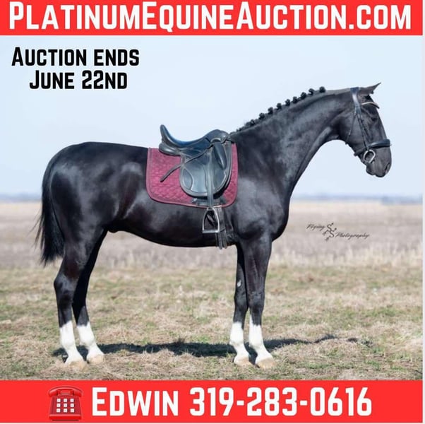 ONLINE AUCTION Place your bids at www.PlatinumEquineAuction.com Starting Bid $3500 Auction ends June 22nd, 2025 Need a new saddle? Check out White Rock Saddles on our website or Facebook! Smoke is a 6-year-old, grade Dutch gelding that stands 15.2h. He is very free moving and an absolute natural for dressage and English eventing. Smoke rides English, has been ridden western, and also drives. He is a great prospect and is ready to be taken to the next level in his training! Smoke is stunning with his jet-black color and has all of the chrome you could ask for. Smoke has been ridden indoors and outdoors in arenas, down the highway, and out on the trails. He is traffic safe. Smoke has seen the sights, and rides well outside of the arena. He will cross water, logs, and go through the obstacle courses. He handles time off well and will easily tack up and ride off without issue. Smoke has the stamina and endurance to perform; he is very willing to work for you under saddle. He is advancing quickly in maneuvers and is an elegant prospect for the show ring. Smoke does well when stalled or pastured and gets along with other horses. He is a complete gentleman for the farrier, and very easy to shoe. Smoke is a personable gelding, making it easy to handle him on the ground. He patiently stands cross tied and also stands for the mounting block. Smoke will get along best with an intermediate to advanced rider where he can continue to excel in his training. He is most comfortable under saddle, and that is where the focus of his training has been. Smoke has a fancy style that easily catches your attention! If you’re looking for a nice gelding to show or ride for pleasure, don’t miss out on Smoke! He is current on Coggins and also has a PPE on file. If you have any questions or would like to meet Smoke prior to the auction ending, please call Edwin Raber 319-283-0616 Located in Fairbank, IA. ONLINE AUCTION Place your bids at www.PlatinumEquineAuction.com Starting Bid $3500 Auction ends June 22nd, 2025 Need a new saddle? Check out White Rock Saddles on our website or Facebook!