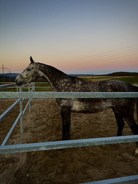 Schweren Herzens biete ich meinen 8 Jährigen Wallach Giovanni zum Verkauf an. Giovanni ist ein sehr aufgeschlossenes und ausgeglichenes Pferd. Er wurde Dressur gezogen, zeigt aber auch einen guten Sprung. Auch im Gelände ist er stets sicher und unerschrocken unterwegs. Im Umgang ist er einfach nur ein absolut liebenswürdiges Pferd, was sich auch von Kindern an der Nase spielen lässt und keinerlei Unarten zeigt. Er war bereits auf eine Gelände Springplatz und auf fremden Höfen zum reiten, auch dort zeigte er sich wie ein kleiner Profi. So brav wie er auch ist, ist er kein Anfänger oder Wiedereinsteiger Pferd. Er fordert seinen Reiter und möchte geritten werden. Sobald eine Hilfe nicht sitzt, zeigt er dies deutlich. Giovanni geht nur in Allerbeste Hände und ist absolut kein Not Verkauf !! Bei weiteren Fragen stehe ich gerne zur Verfügung.